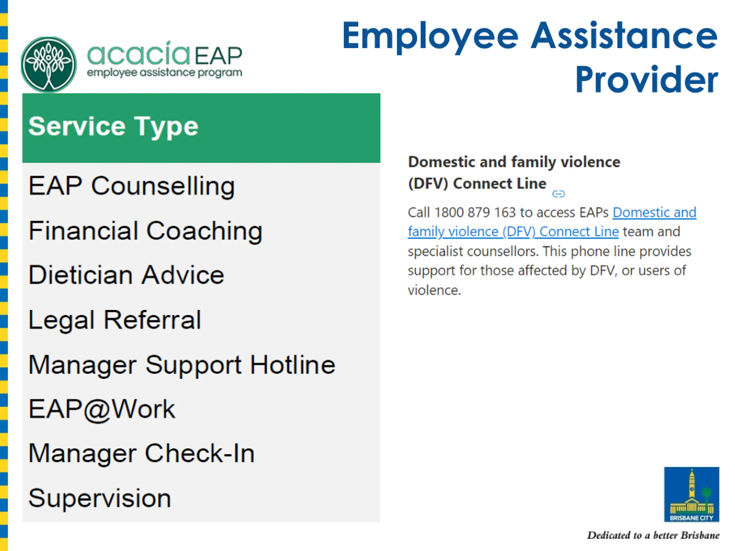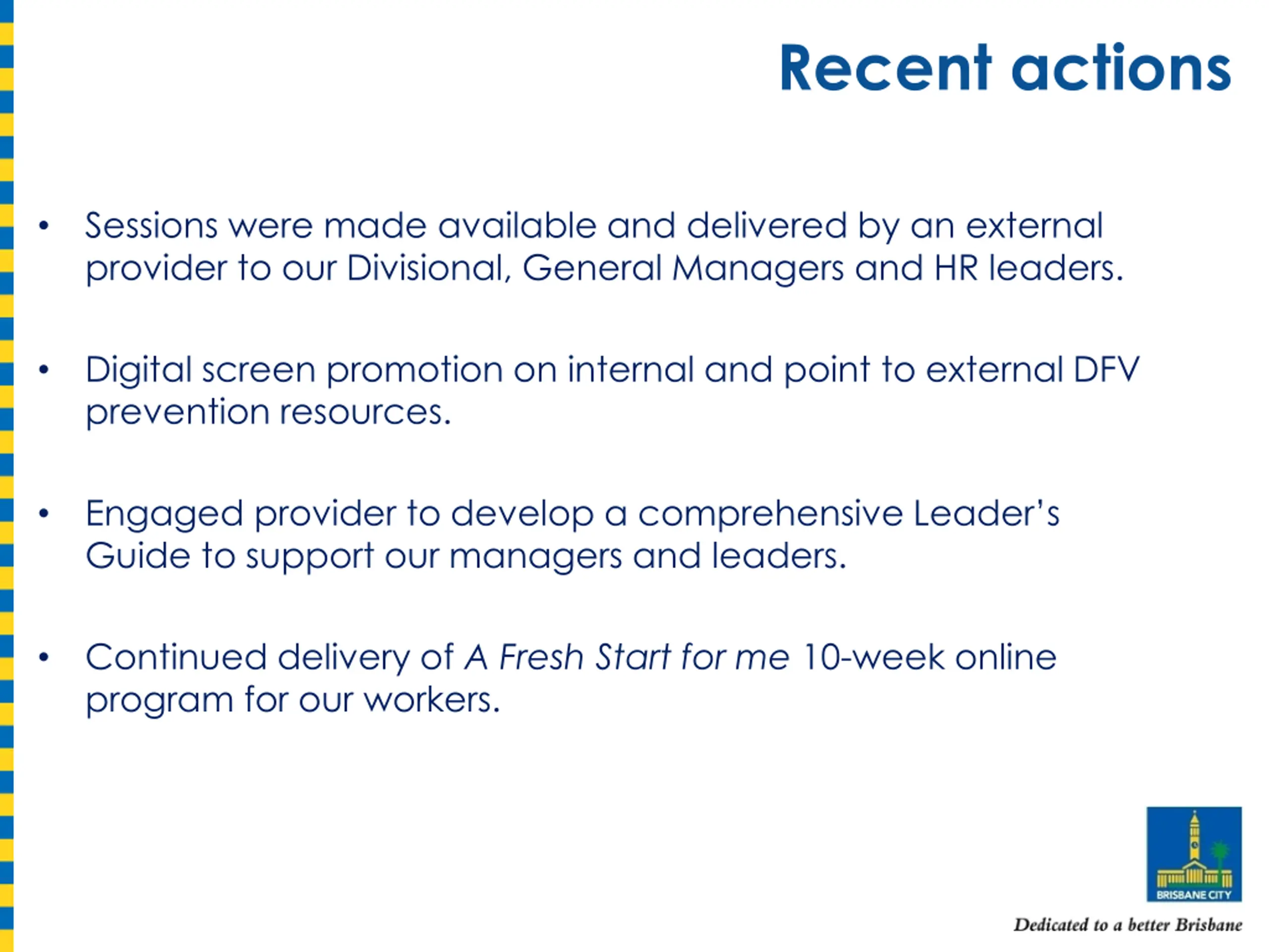 Recent actions Sessions were made available and delivered by an external provider to our Divisional, General Managers and HR leaders. Digital screen promotion on internal and point to external DFV prevention resources. Engaged provider to develop a comprehensive Leader s Guide to support our managers and leaders. Continued delivery of A Fresh Start for me 10-week online program for our workers.