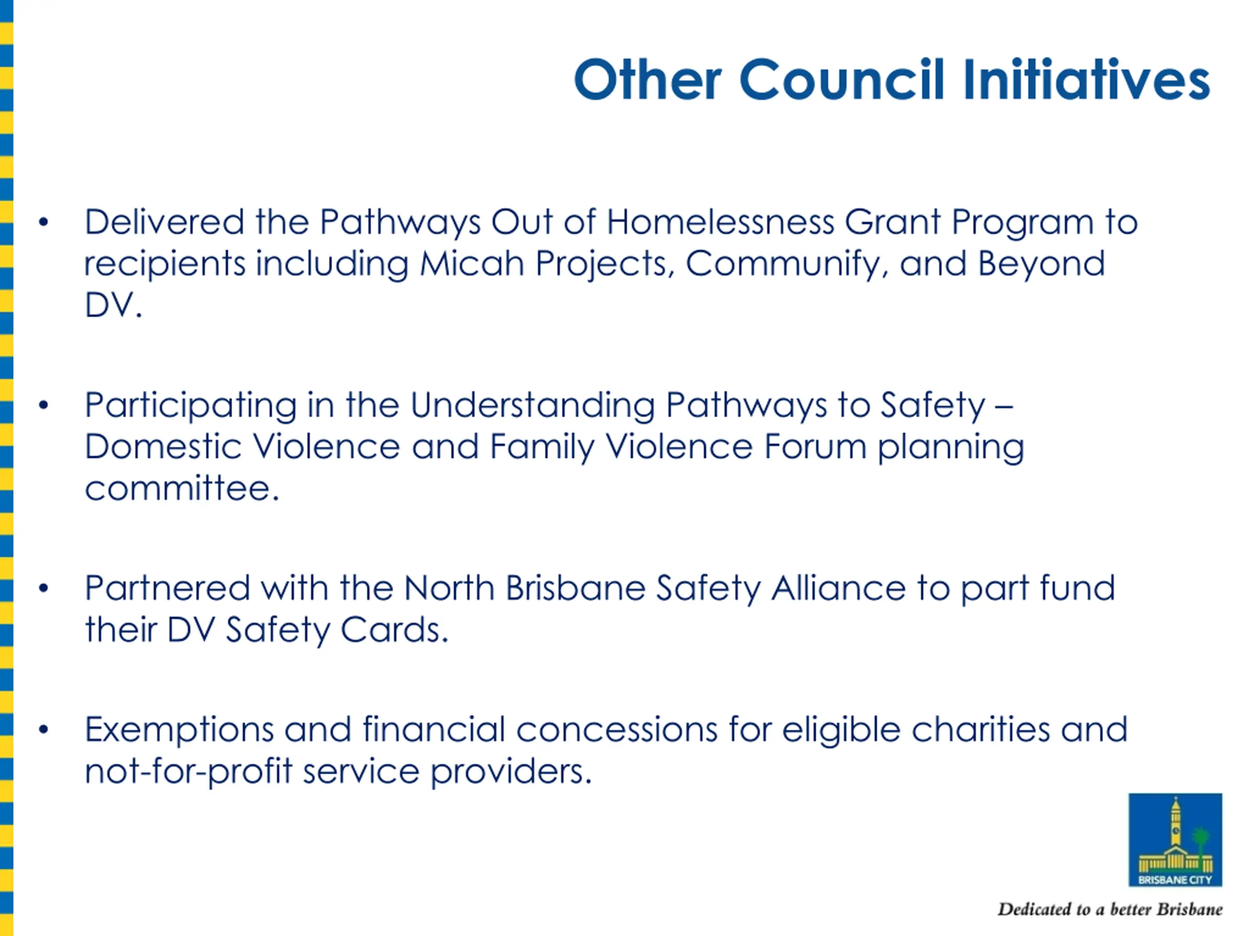 Other Council Initiatives Delivered the Pathways Out of Homelessness Grant Program to recipients including Micah Projects, Communify, and Beyond DV. Participating in the Understanding Pathways to Safety Domestic Violence and Family Violence Forum planning committee. Partnered with the North Brisbane Safety Alliance to part fund their DV Safety Cards. Exemptions and financial concessions for eligible charities and not-for-profit service providers.