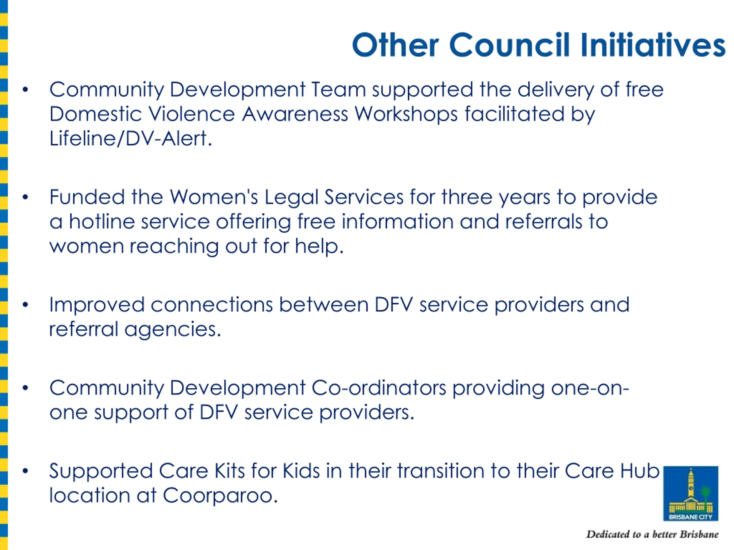 Other Council Initiatives Community Development Team supported the delivery of free Domestic Violence Awareness Workshops facilitated by Lifeline/DV-Alert. Funded the Women's Legal Services for three years to provide a hotline service offering free information and referrals to women reaching out for help. Improved connections between DFV service providers and referral agencies. Community Development Co-ordinators providing one-on- one support of DFV service providers. Supported Care Kits for Kids in their transition to their Care Hub location at Coorparoo.