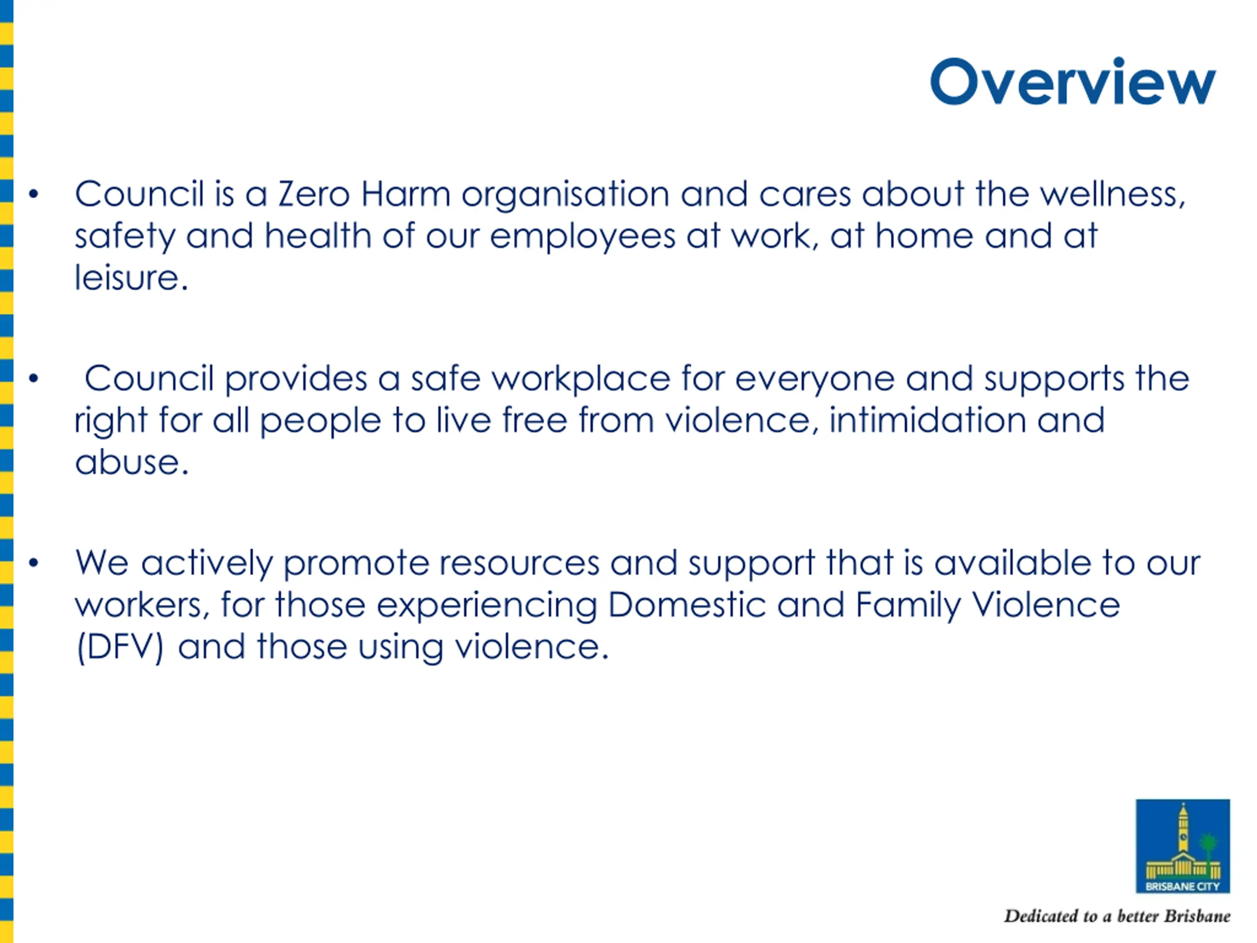 Overview Council is a Zero Harm organisation and cares about the wellness, safety and health of our employees at work, at home and at leisure. Council provides a safe workplace for everyone and supports the right for all people to live free from violence, intimidation and abuse. We actively promote resources and support that is available to our workers, for those experiencing Domestic and Family Violence (DFV) and those using violence.