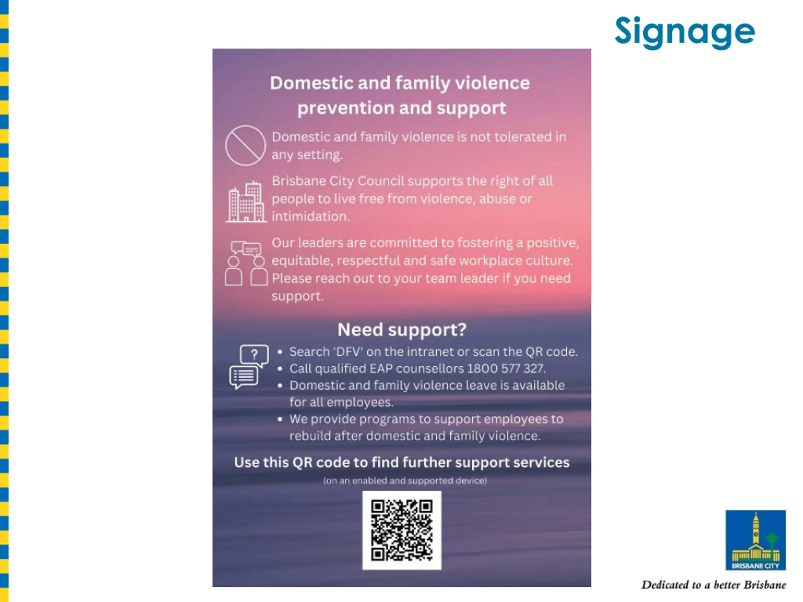 May 2023 Domestic and Family Violence prevention month Sponsorship of the Darkness to Daylight event and Council fundraising team formed. Distribution of Power and Control / Equality wheels, promoted by an internal video featuring Vanessa Fowler - Co-Chair of the Domestic and Family Violence Prevention Council and Chair of the Allison Baden-Clay Foundation. Sponsorship of the Pathways to Safety conference 11 May 2023. Webinars and face to face sessions. Civic event held in City Hall in honour of the advocates that support the awareness and prevention of Domestic and Family Violence. Community Support funding for LGBTQ Domestic Violence Awareness Foundation Light Up The Night Gala at City Hall on 5 May 2023.