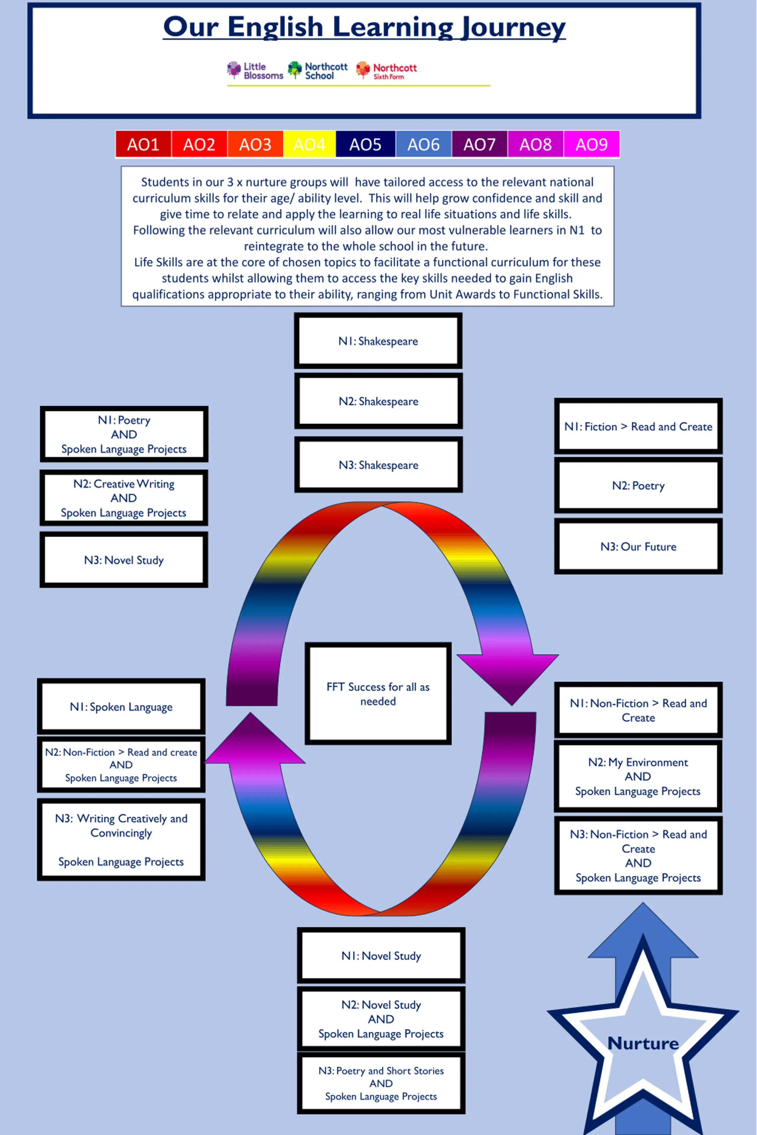 Our English Learning Journey AO1 AO2 AO3 AO4 AO5 AO6 AO7 AO8 AO9 Students in our 3 x nurture groups will have tailored access to the relevant national curriculum skills for their age/ ability level. This will help grow confidence and skill and give time to relate and apply the learning to real life situations and life skills. Following the relevant curriculum will also allow our most vulnerable learners in N1 to reintegrate to the whole school in the future. Life Skills are at the core of chosen topics to facilitate a functional curriculum for these students whilst allowing them to access the key skills needed to gain English qualifications appropriate to their ability, ranging from Unit Awards to Functional Skills. N1: Shakespeare N2: Shakespeare N1: Poetry AND N1: Fiction > Read and Create Spoken Language Projects N3: Shakespeare N2: Creative Writing AND Spoken Language Projects N2: Poetry N3: Our Future N3: Novel Study FFT Success for all as needed N1: Non-Fiction > Read and Create N1: Spoken Language N2: Non-Fiction > Read and create AND Spoken Language Projects N2: My Environment AND Spoken Language Projects N3: Writing Creatively and Convincingly N3: Non-Fiction > Read and Create AND Spoken Language Projects Spoken Language Projects N1: Novel Study N2: Novel Study AND Spoken Language Projects Nurture v N3: Poetry and Short Stories AND Spoken Language Projects