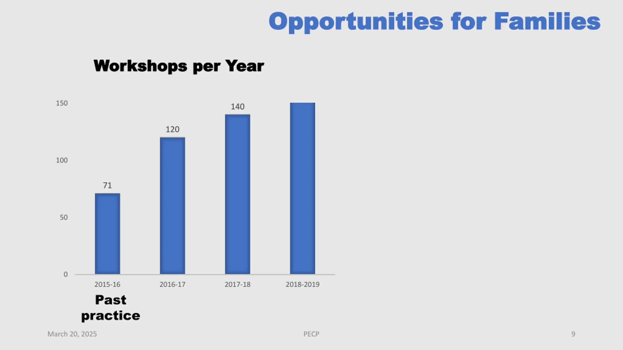 Opportunities for Opportunities for Families Families Workshops per Year Workshops per Year 150 140 120 100 71 50 0 2015-16 Past practice 2016-17 2017-18 2018-2019 March 20, 2025 PECP 9