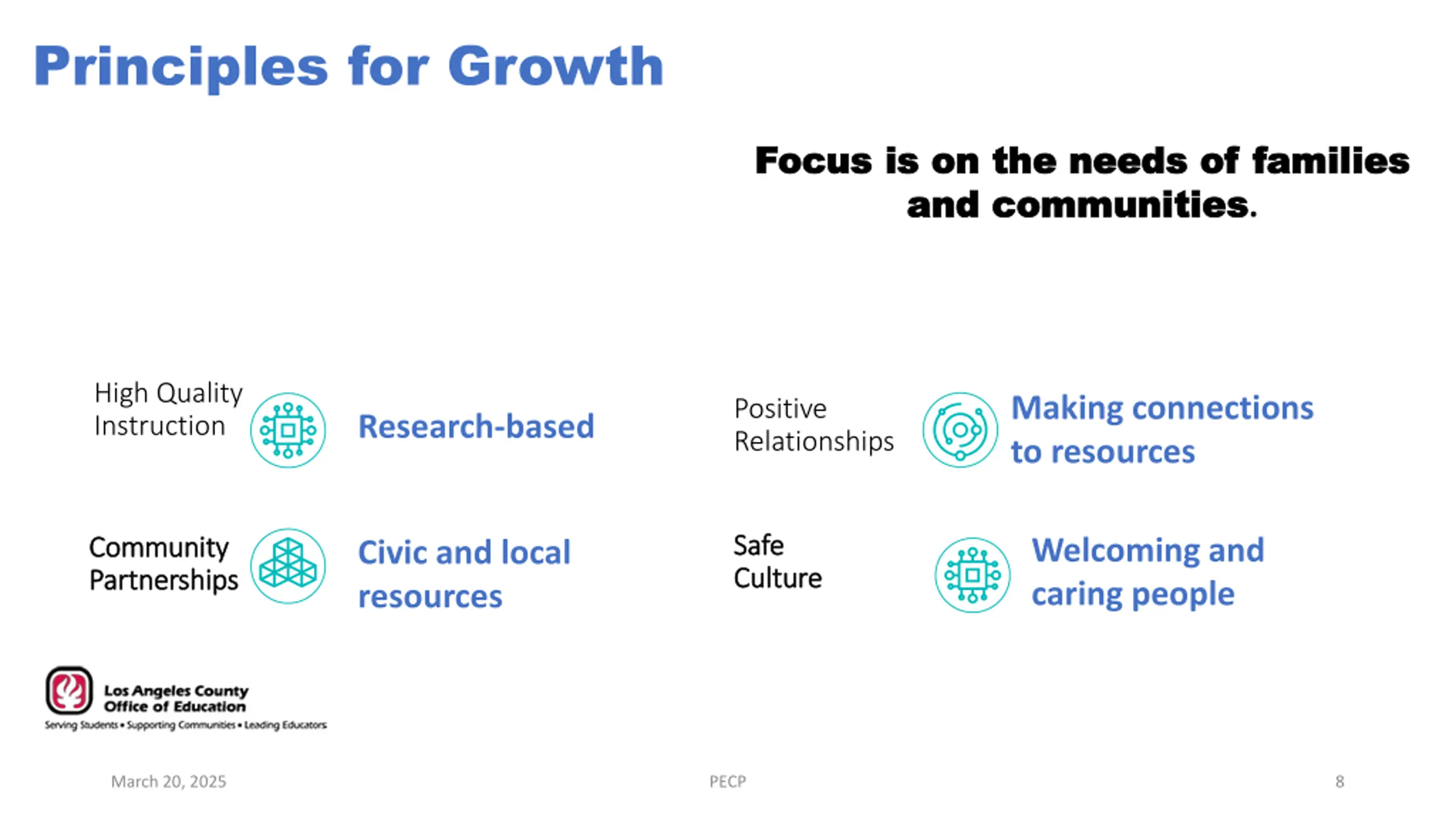 Principles for Growth Focus is on the needs of families Focus is on the needs of families and communities and communities. High Quality Instruction Making connections to resources Positive Relationships Research-based Safe Safe Culture Culture Community Community Partnerships Partnerships Welcoming and caring people Civic and local resources March 20, 2025 PECP 8