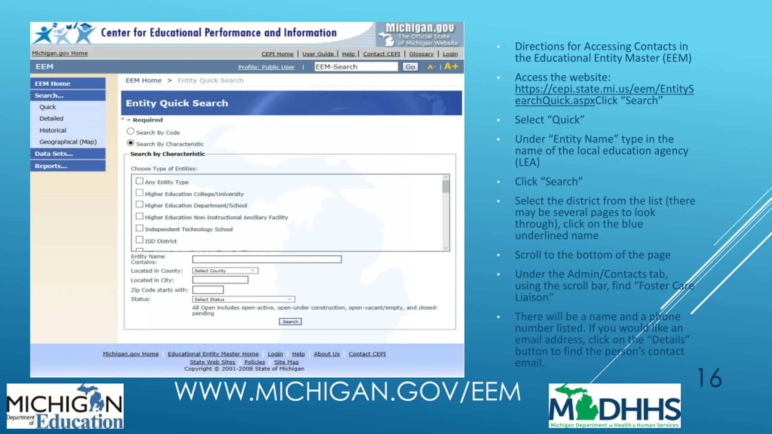 Directions for Accessing Contacts in the Educational Entity Master (EEM) Access the website: https://cepi.state.mi.us/eem/EntityS earchQuick.aspxClick Search Select Quick Under Entity Name type in the name of the local education agency (LEA) Click Search Select the district from the list (there may be several pages to look through), click on the blue underlined name Scroll to the bottom of the page Under the Admin/Contacts tab, using the scroll bar, find Foster Care Liaison There will be a name and a phone number listed. If you would like an email address, click on the Details button to find the person s contact email. 16 WWW.MICHIGAN.GOV/EEM