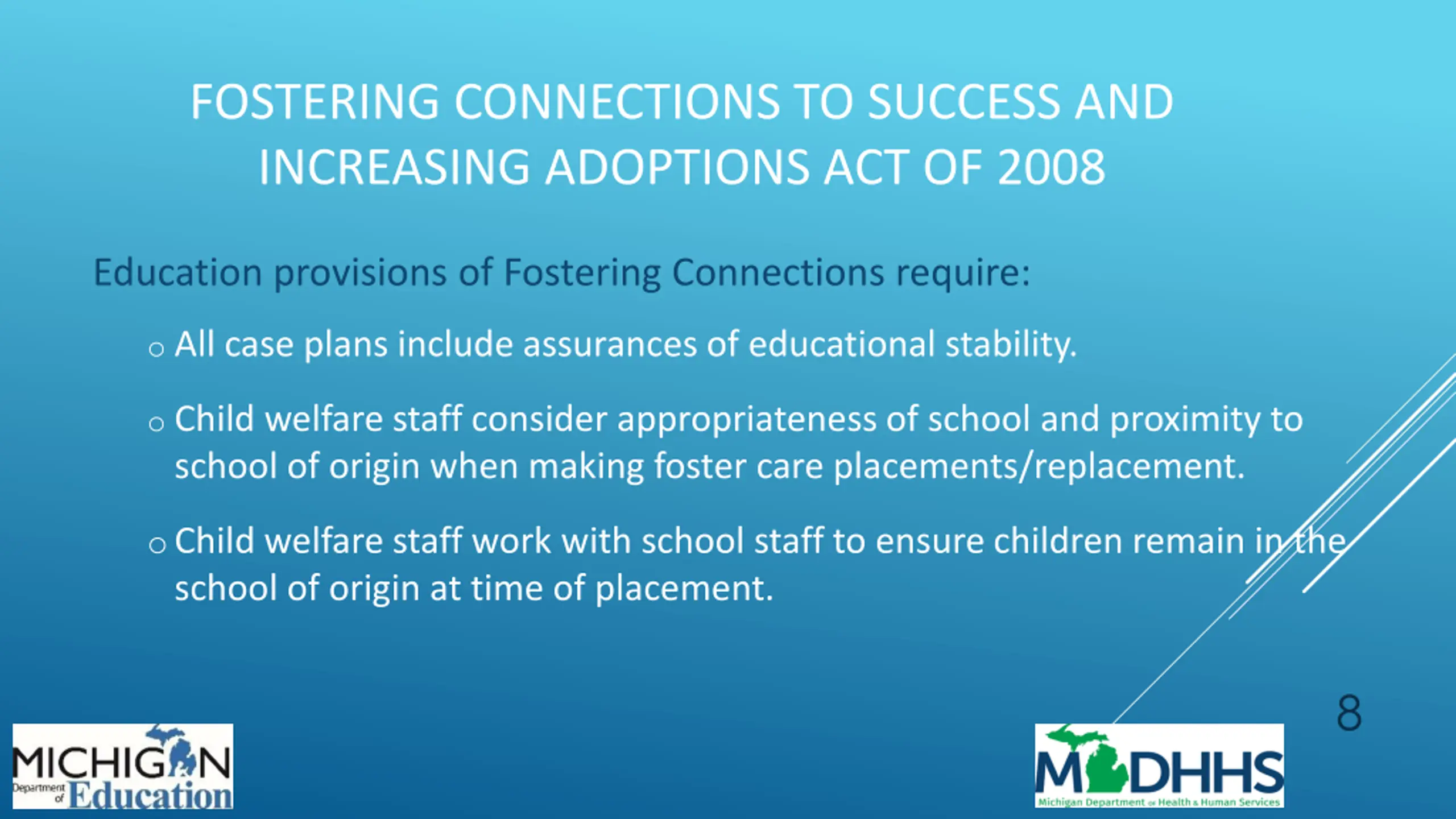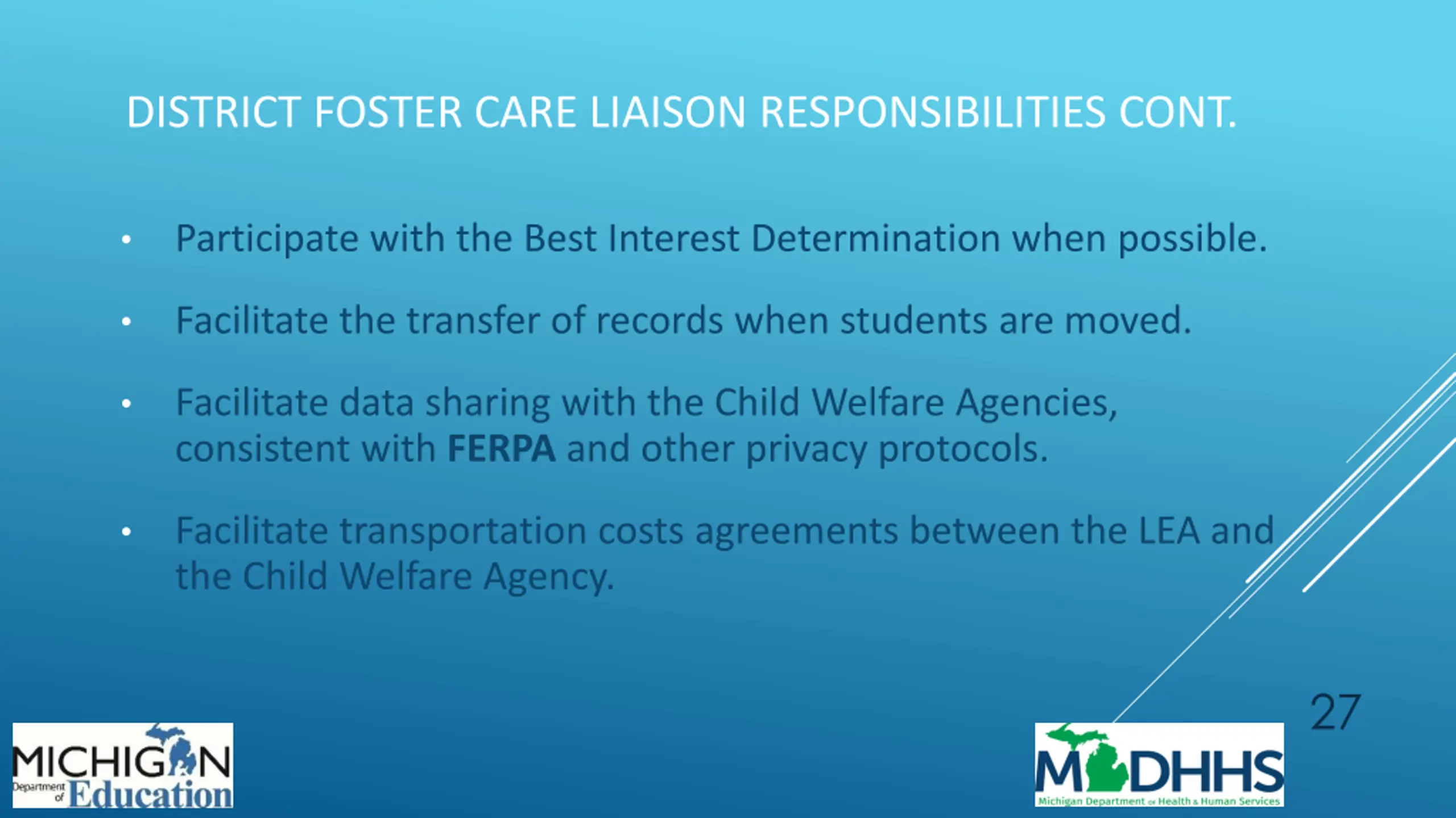 MDHHS EDUCATION PLANNERS Specialized MDHHS staff that work with youth age 14 and up with open foster care cases on education issues. 18 planners that currently cover 48 counties. Receive regular, ongoing detailed training: Federal and state education law and policy Federal and state child welfare law and policy Special Education Best interest determination Higher education preparation and resources Older youth resources 21