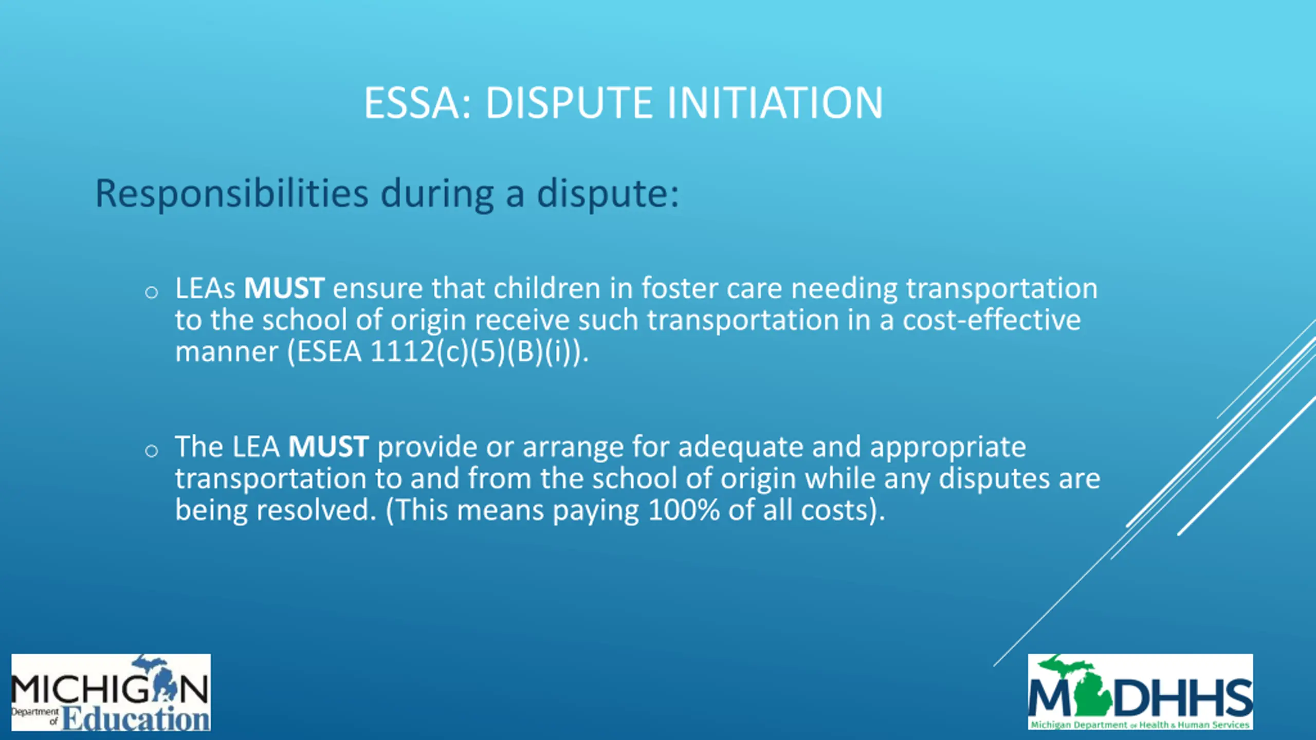 ESSA: DISPUTE INITIATION Responsibilities during a dispute: o LEAs MUST ensure that children in foster care needing transportation to the school of origin receive such transportation in a cost-effective manner (ESEA 1112(c)(5)(B)(i)). o The LEA MUST provide or arrange for adequate and appropriate transportation to and from the school of origin while any disputes are being resolved. (This means paying 100% of all costs).