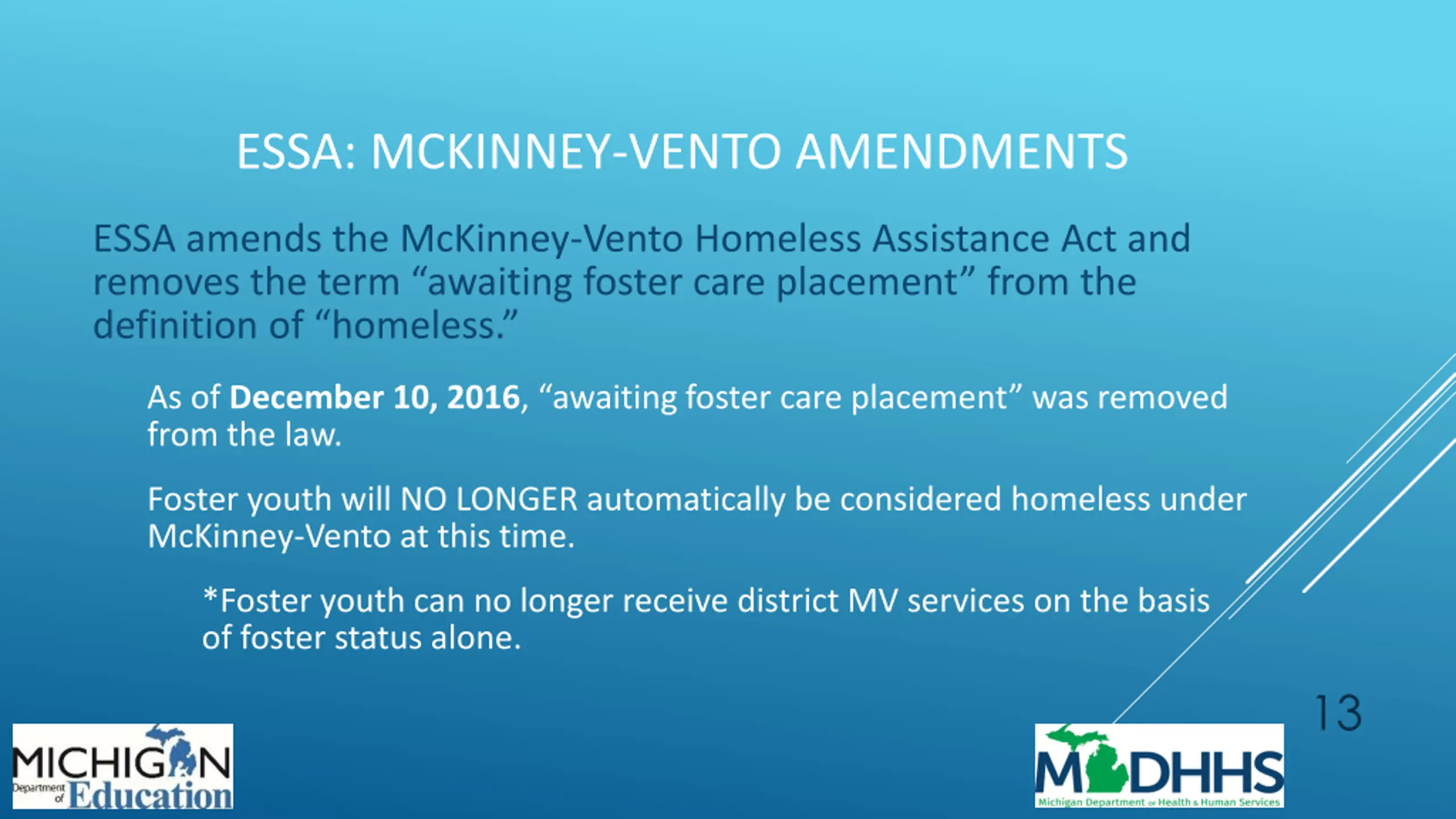 ESSA: MCKINNEY-VENTO AMENDMENTS ESSA amends the McKinney-Vento Homeless Assistance Act and removes the term awaiting foster care placement from the definition of homeless. As of December 10, 2016, awaiting foster care placement was removed from the law. Foster youth will NO LONGER automatically be considered homeless under McKinney-Vento at this time. *Foster youth can no longer receive district MV services on the basis of foster status alone. 13