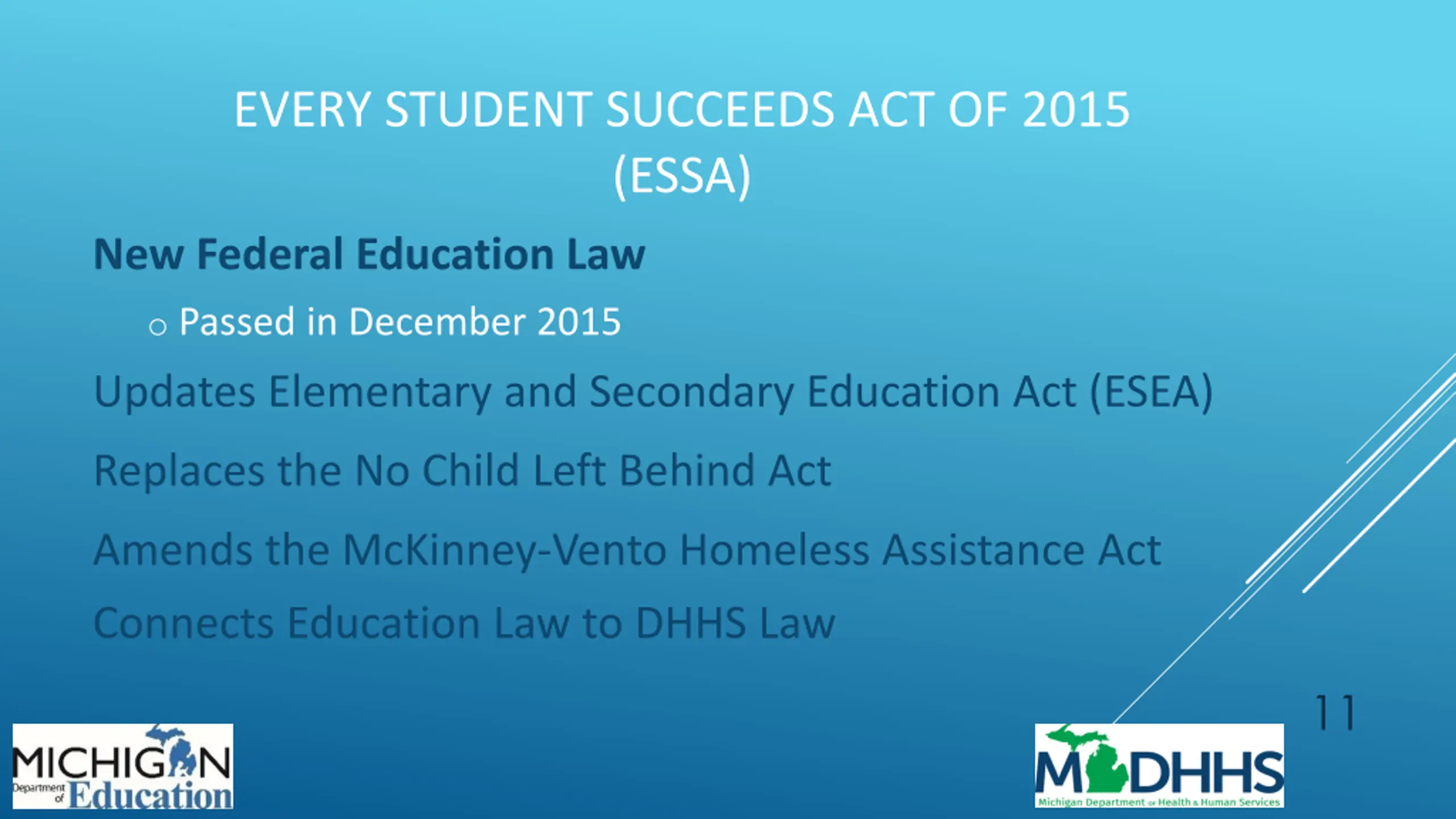 EVERY STUDENT SUCCEEDS ACT OF 2015 (ESSA) New Federal Education Law o Passed in December 2015 Updates Elementary and Secondary Education Act (ESEA) Replaces the No Child Left Behind Act Amends the McKinney-Vento Homeless Assistance Act Connects Education Law to DHHS Law 11