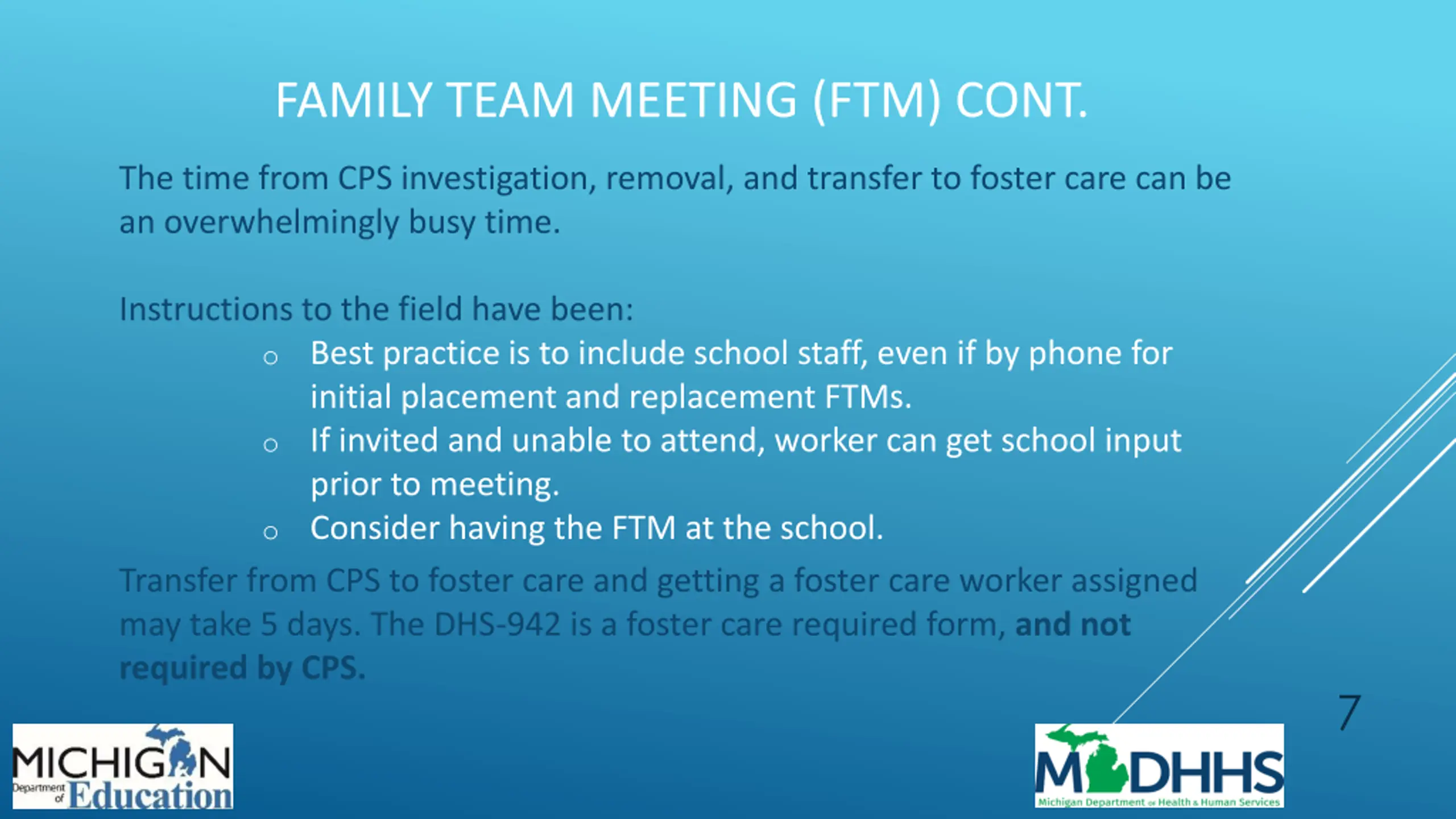 FAMILY TEAM MEETING (FTM) CONT. The time from CPS investigation, removal, and transfer to foster care can be an overwhelmingly busy time. Instructions to the field have been: o Best practice is to include school staff, even if by phone for initial placement and replacement FTMs. o If invited and unable to attend, worker can get school input prior to meeting. o Consider having the FTM at the school. Transfer from CPS to foster care and getting a foster care worker assigned may take 5 days. The DHS-942 is a foster care required form, and not required by CPS. 7