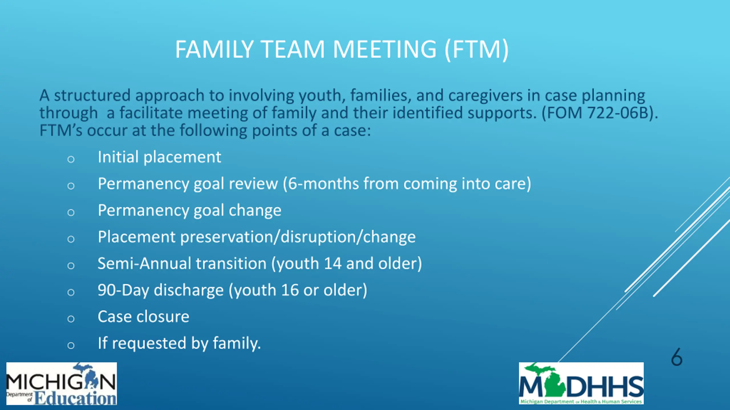 FAMILY TEAM MEETING (FTM) A structured approach to involving youth, families, and caregivers in case planning through a facilitate meeting of family and their identified supports. (FOM 722-06B). FTM s occur at the following points of a case: Initial placement Permanency goal review (6-months from coming into care) Permanency goal change Placement preservation/disruption/change Semi-Annual transition (youth 14 and older) 90-Day discharge (youth 16 or older) Case closure If requested by family. o o o o o o o o 6