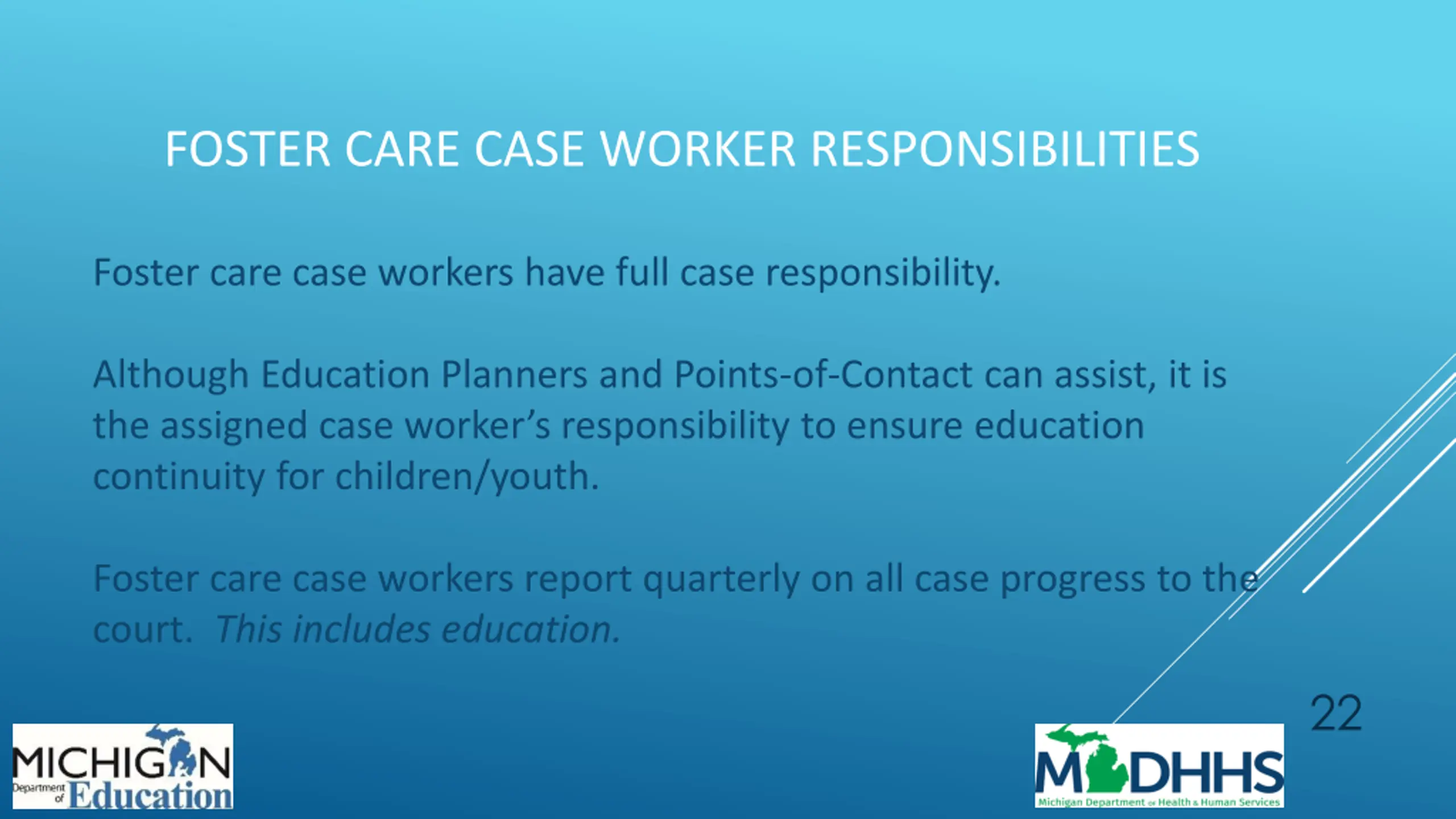 FOSTER CARE CASE WORKER RESPONSIBILITIES Foster care case workers have full case responsibility. Although Education Planners and Points-of-Contact can assist, it is the assigned case worker s responsibility to ensure education continuity for children/youth. Foster care case workers report quarterly on all case progress to the court. This includes education. 22