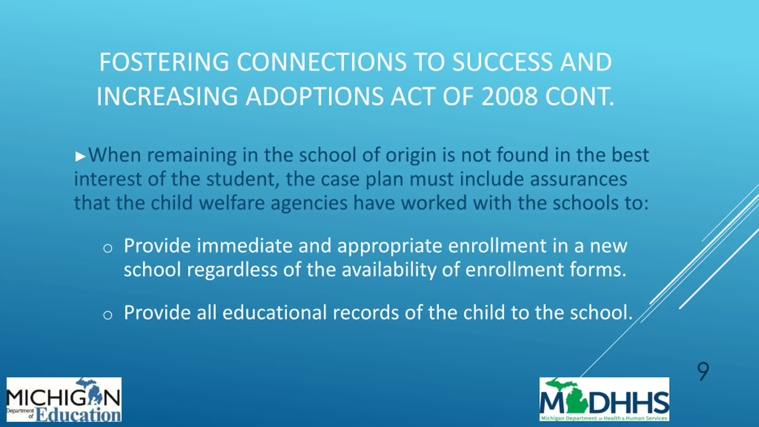 FOSTERING CONNECTIONS TO SUCCESS AND INCREASING ADOPTIONS ACT OF 2008 Education provisions of Fostering Connections require: o All case plans include assurances of educational stability. o Child welfare staff consider appropriateness of school and proximity to school of origin when making foster care placements/replacement. oChild welfare staff work with school staff to ensure children remain in the school of origin at time of placement. 8