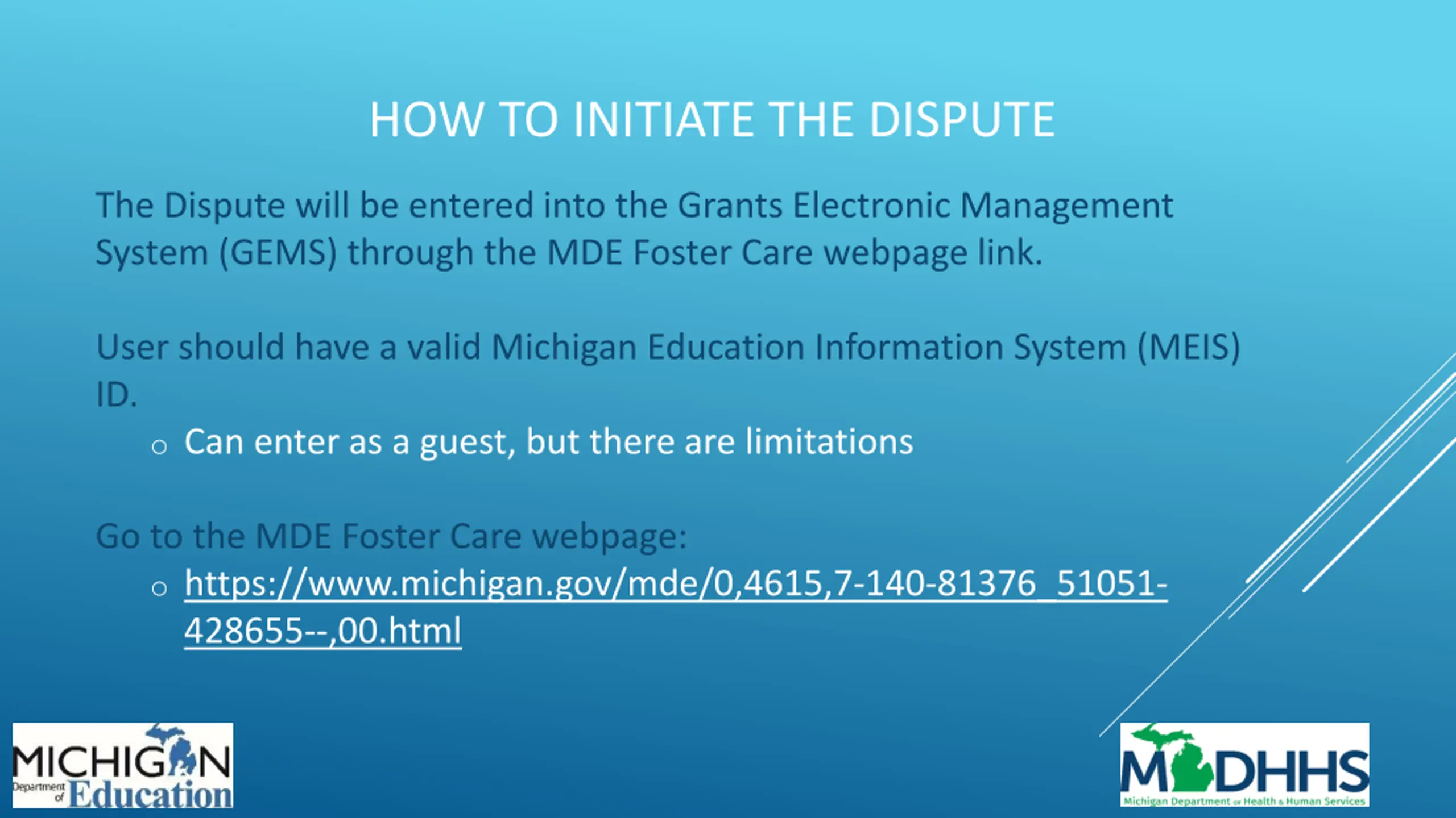HOW TO INITIATE THE DISPUTE The Dispute will be entered into the Grants Electronic Management System (GEMS) through the MDE Foster Care webpage link. User should have a valid Michigan Education Information System (MEIS) ID. o Can enter as a guest, but there are limitations Go to the MDE Foster Care webpage: o https://www.michigan.gov/mde/0,4615,7-140-81376_51051- 428655--,00.html