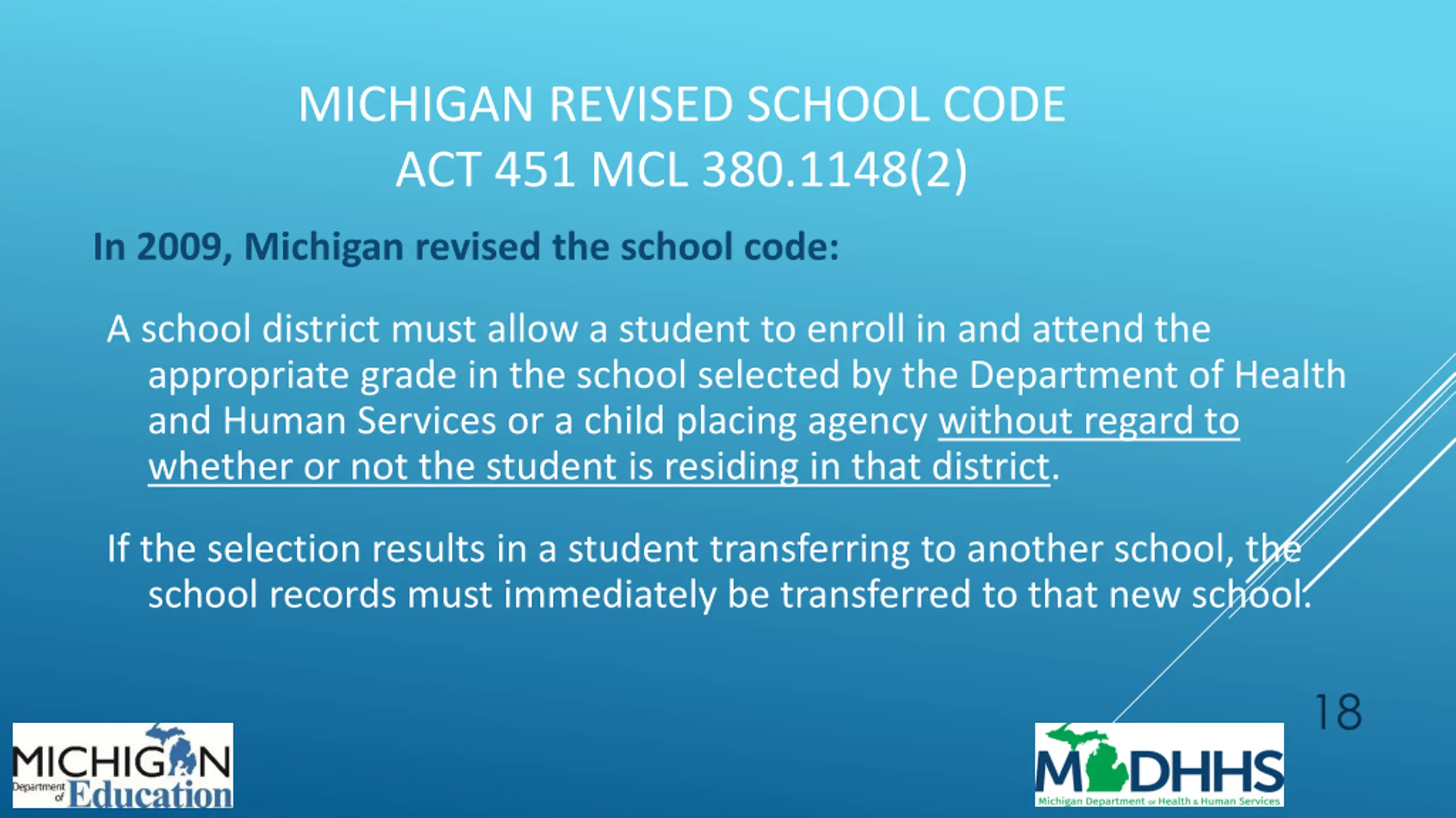 MICHIGAN REVISED SCHOOL CODE ACT 451 MCL 380.1148(2) In 2009, Michigan revised the school code: A school district must allow a student to enroll in and attend the appropriate grade in the school selected by the Department of Health and Human Services or a child placing agency without regard to whether or not the student is residing in that district. If the selection results in a student transferring to another school, the school records must immediately be transferred to that new school. 18