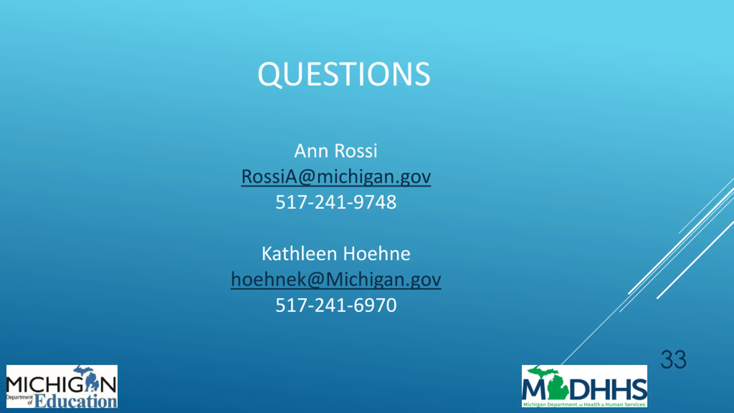 QUESTIONS Ann Rossi RossiA@michigan.gov 517-241-9748 Kathleen Hoehne hoehnek@Michigan.gov 517-241-6970 33