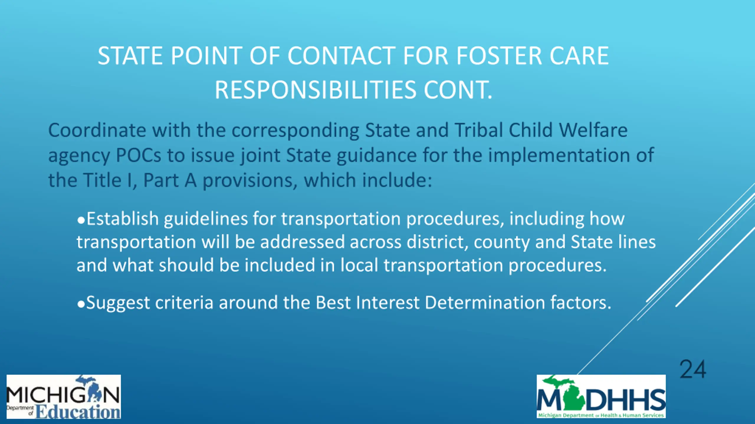 STATE POINT OF CONTACT FOR FOSTER CARE RESPONSIBILITIES CONT. Coordinate with the corresponding State and Tribal Child Welfare agency POCs to issue joint State guidance for the implementation of the Title I, Part A provisions, which include: Establish guidelines for transportation procedures, including how transportation will be addressed across district, county and State lines and what should be included in local transportation procedures. Suggest criteria around the Best Interest Determination factors. 24