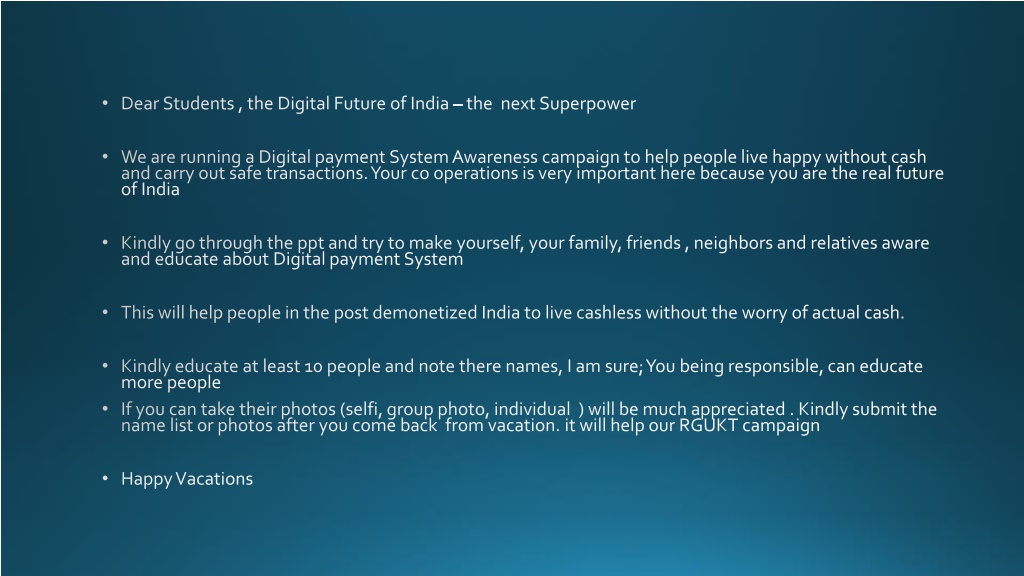 Dear Students , the Digital Future of India the next Superpower We are running a Digital payment System Awareness campaign to help people live happy without cash and carry out safe transactions. Your co operations is very important here because you are the real future of India Kindly go through the pptand try to make yourself, your family, friends , neighbors and relatives aware and educate about Digital payment System This will help people in the post demonetized India to live cashless without the worry of actual cash. Kindly educate at least 10 people and note there names, I am sure; You being responsible, can educate more people If you can take their photos (selfi, group photo, individual ) will be much appreciated . Kindly submit the name list or photos after you come back from vacation. it will help our RGUKT campaign Happy Vacations