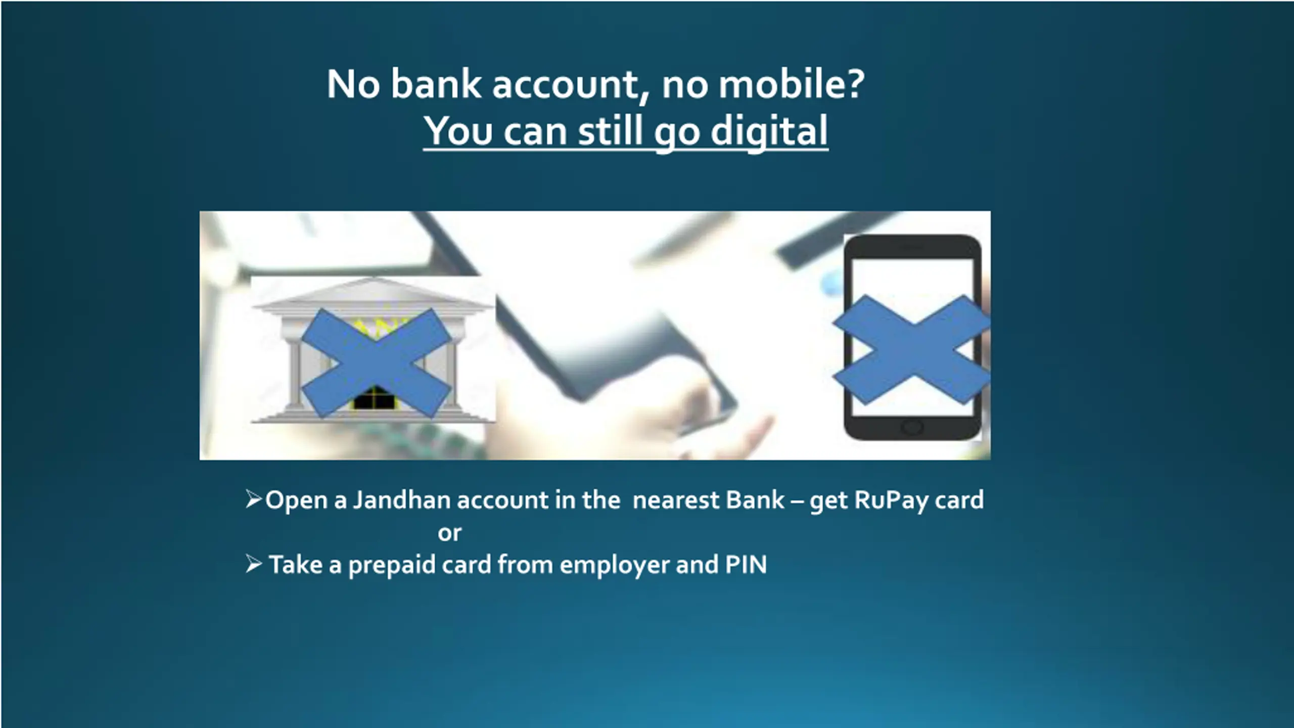 No bank account, no mobile? You can still go digital Open a Jandhan account in the nearest Bank get RuPay card or Take a prepaid card from employer and PIN