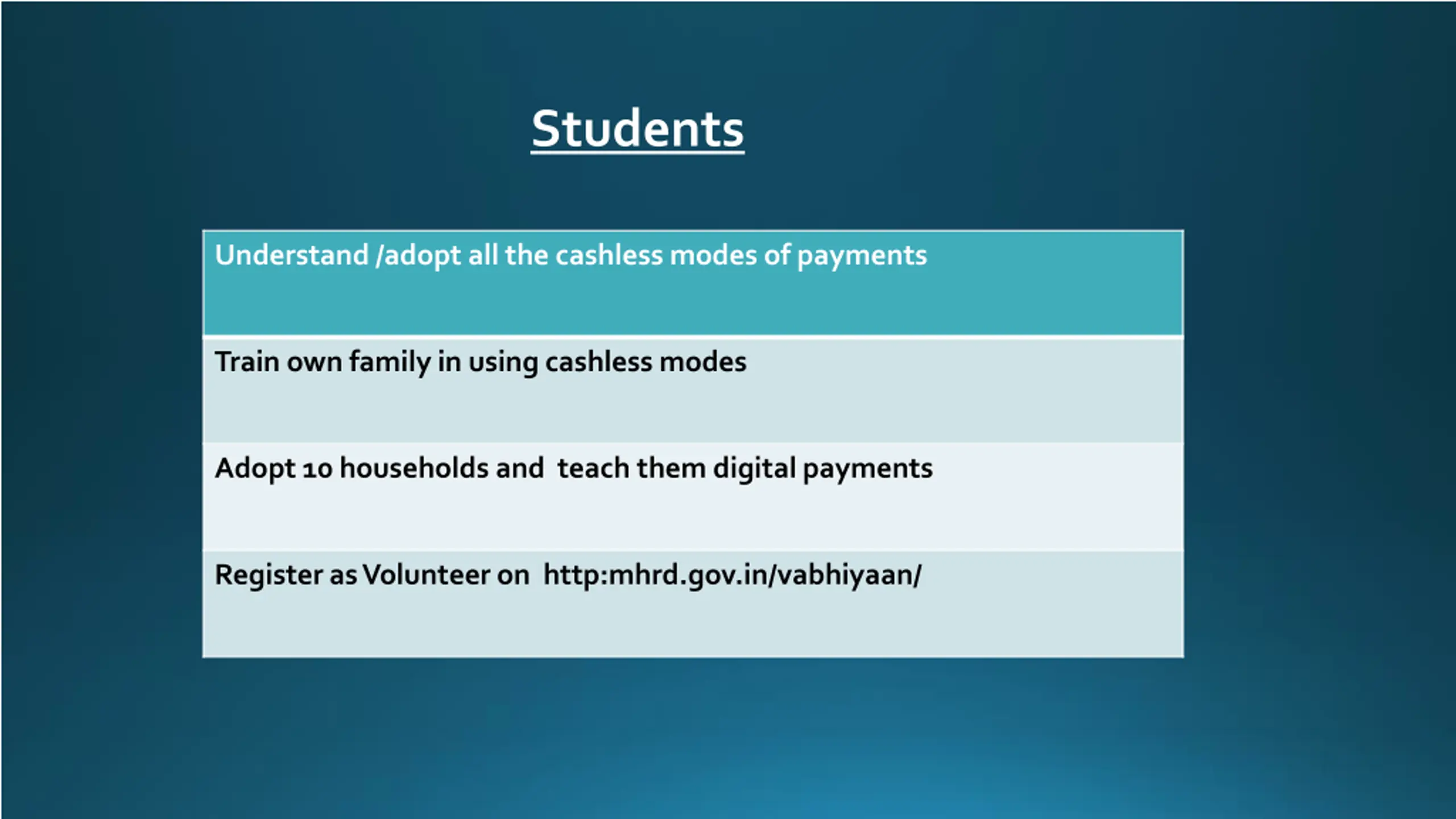 Students Understand /adopt all the cashless modes of payments Train own family in using cashless modes Adopt 10 households and teach them digital payments Register as Volunteer on http:mhrd.gov.in/vabhiyaan/