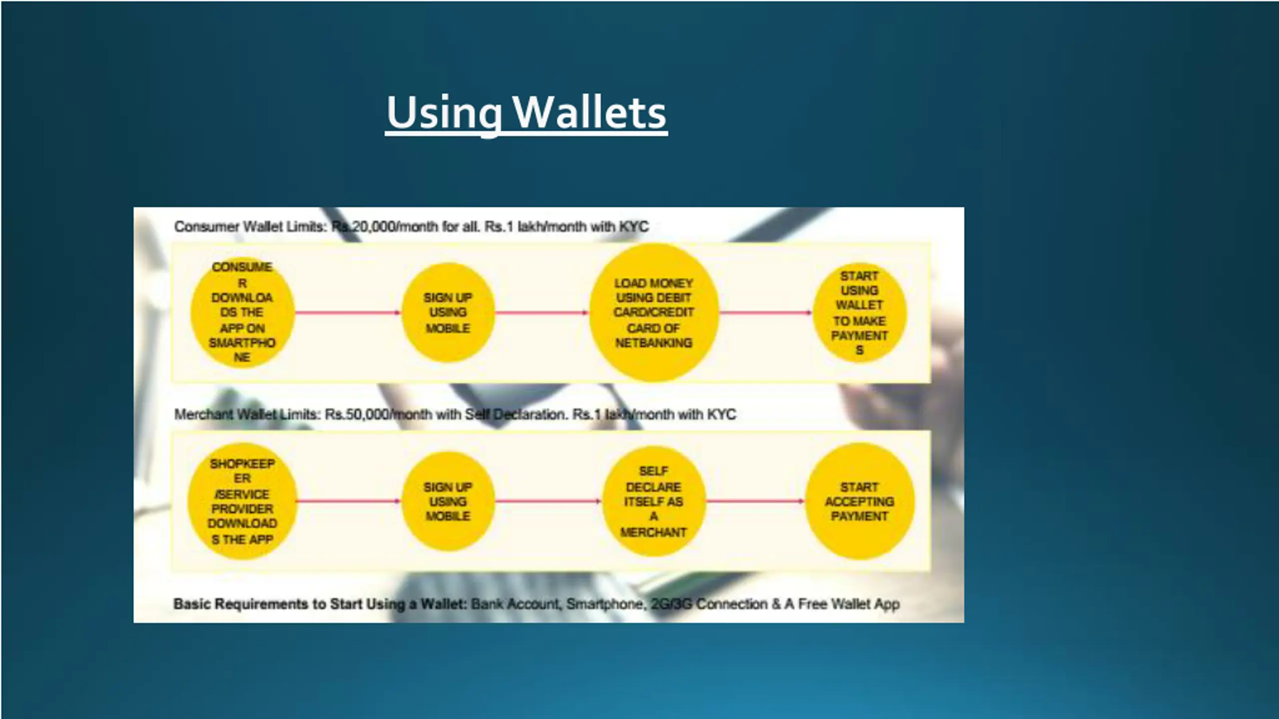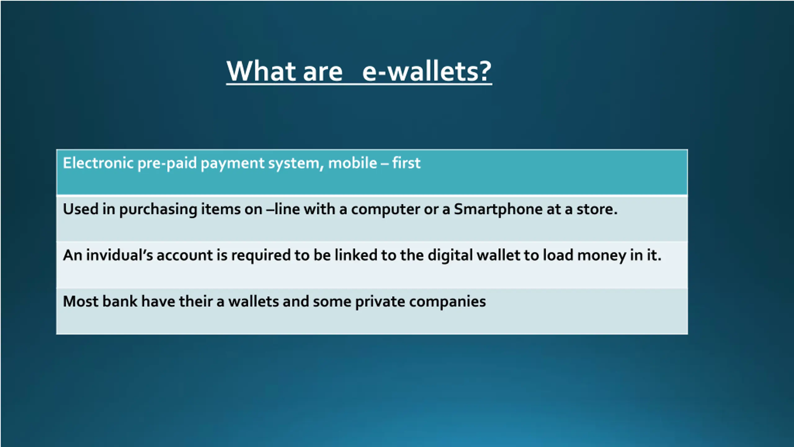 What are e-wallets? Electronic pre-paid payment system, mobile first Used in purchasing items on line with a computer or a Smartphone at a store. An invidual s account is required to be linked to the digital wallet to load money in it. Most bank have their a wallets and some private companies