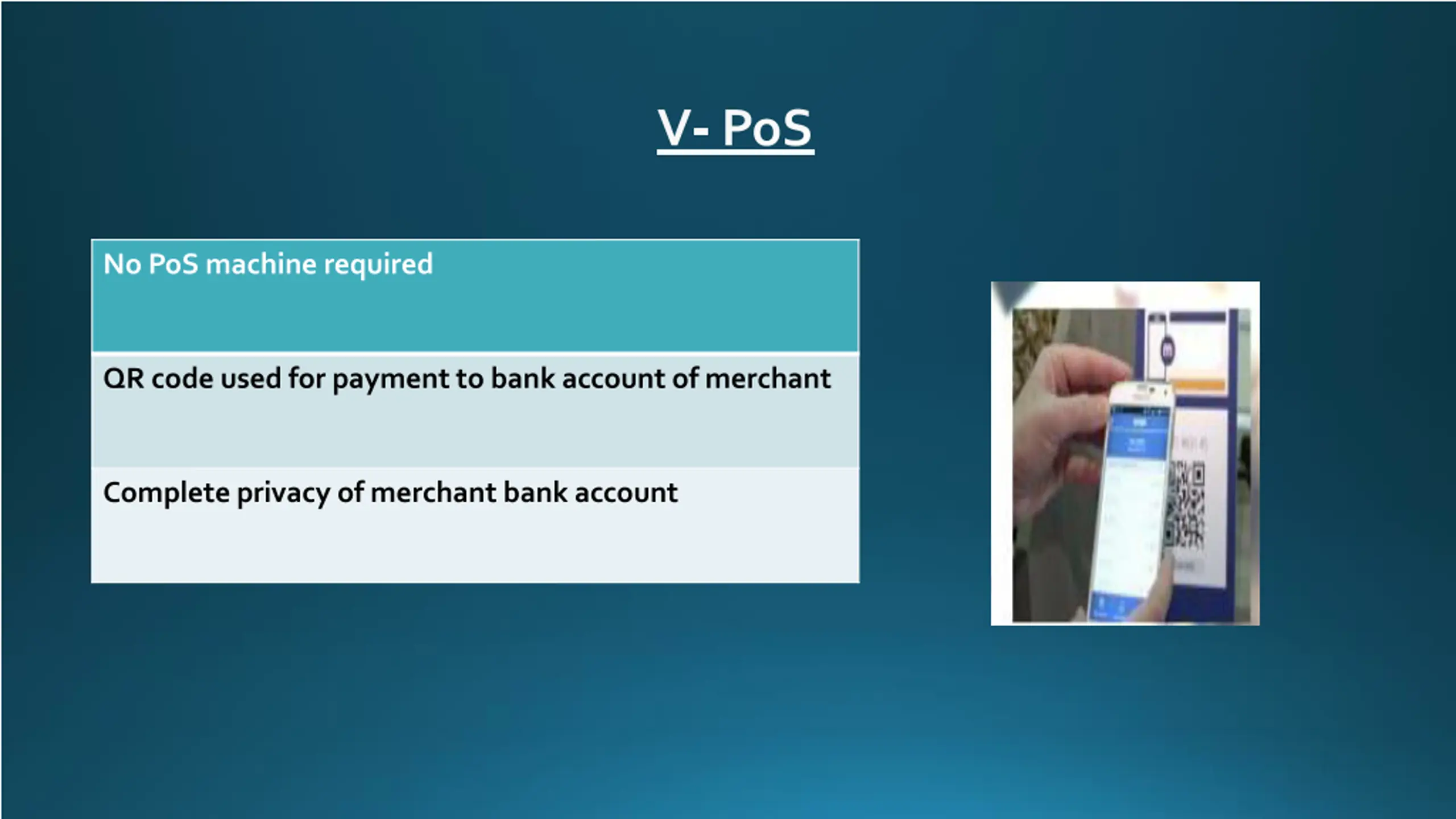 V- PoS No PoS machine required QR code used for payment to bank account of merchant Complete privacy of merchant bank account