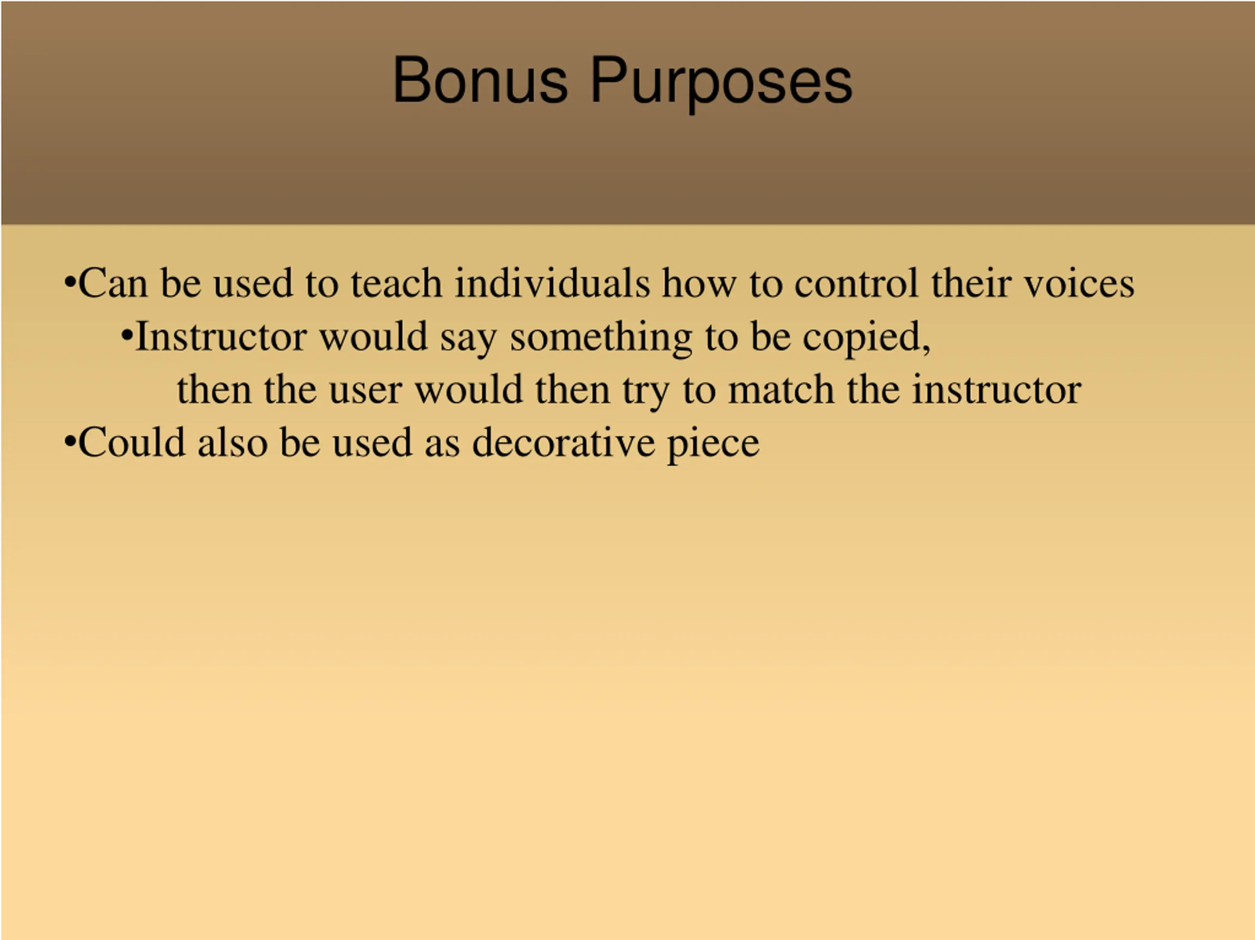 Bonus Purposes Can be used to teach individuals how to control their voices Instructor would say something to be copied, then the user would then try to match the instructor Could also be used as decorative piece