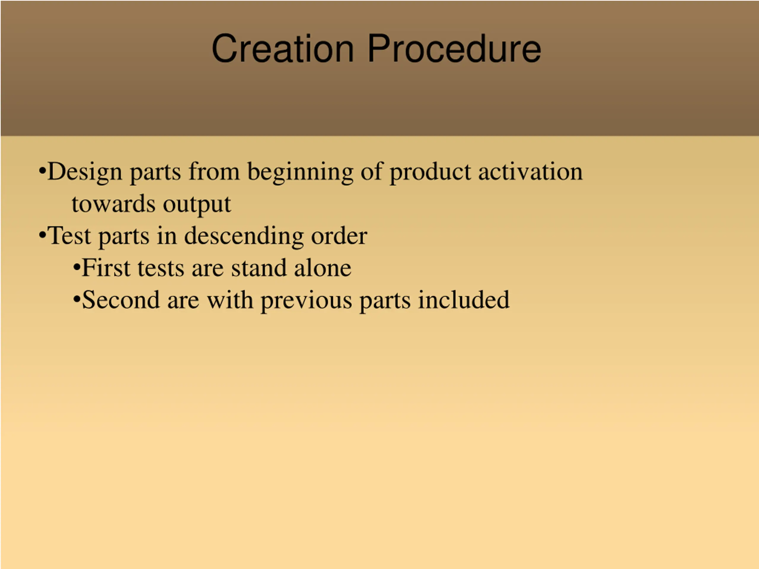 Creation Procedure Design parts from beginning of product activation towards output Test parts in descending order First tests are stand alone Second are with previous parts included