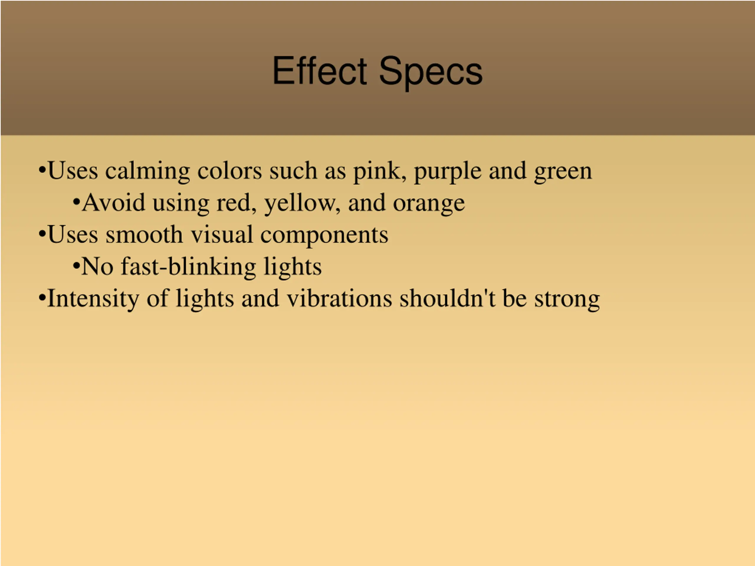 Effect Specs Uses calming colors such as pink, purple and green Avoid using red, yellow, and orange Uses smooth visual components No fast-blinking lights Intensity of lights and vibrations shouldn't be strong