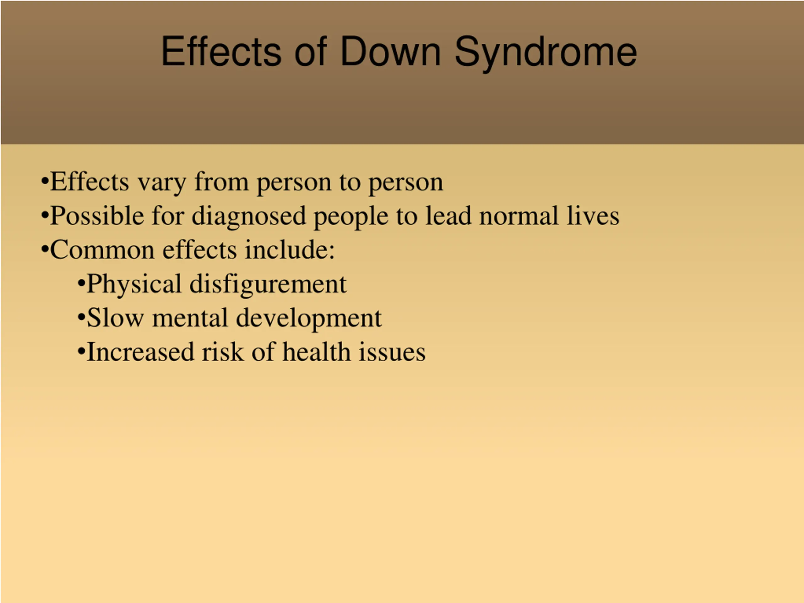 Effects of Down Syndrome Effects vary from person to person Possible for diagnosed people to lead normal lives Common effects include: Physical disfigurement Slow mental development Increased risk of health issues