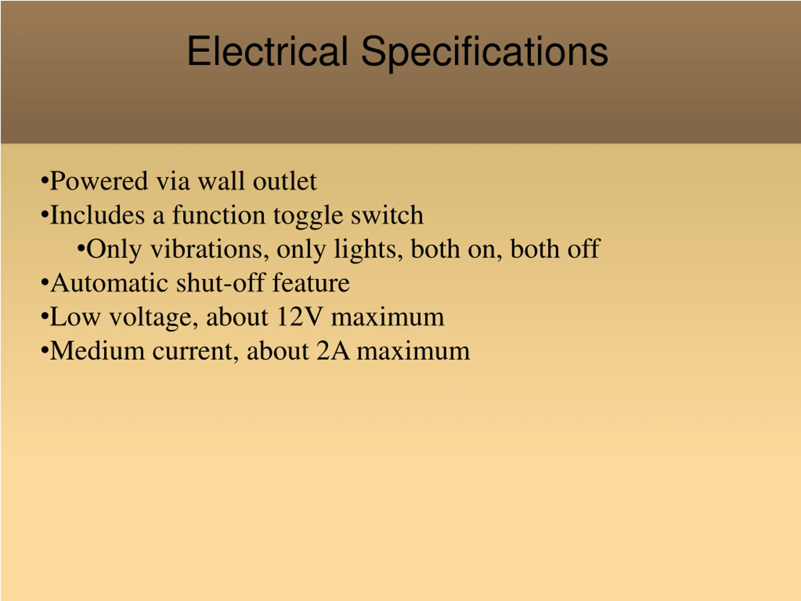 Electrical Specifications Powered via wall outlet Includes a function toggle switch Only vibrations, only lights, both on, both off Automatic shut-off feature Low voltage, about 12V maximum Medium current, about 2A maximum