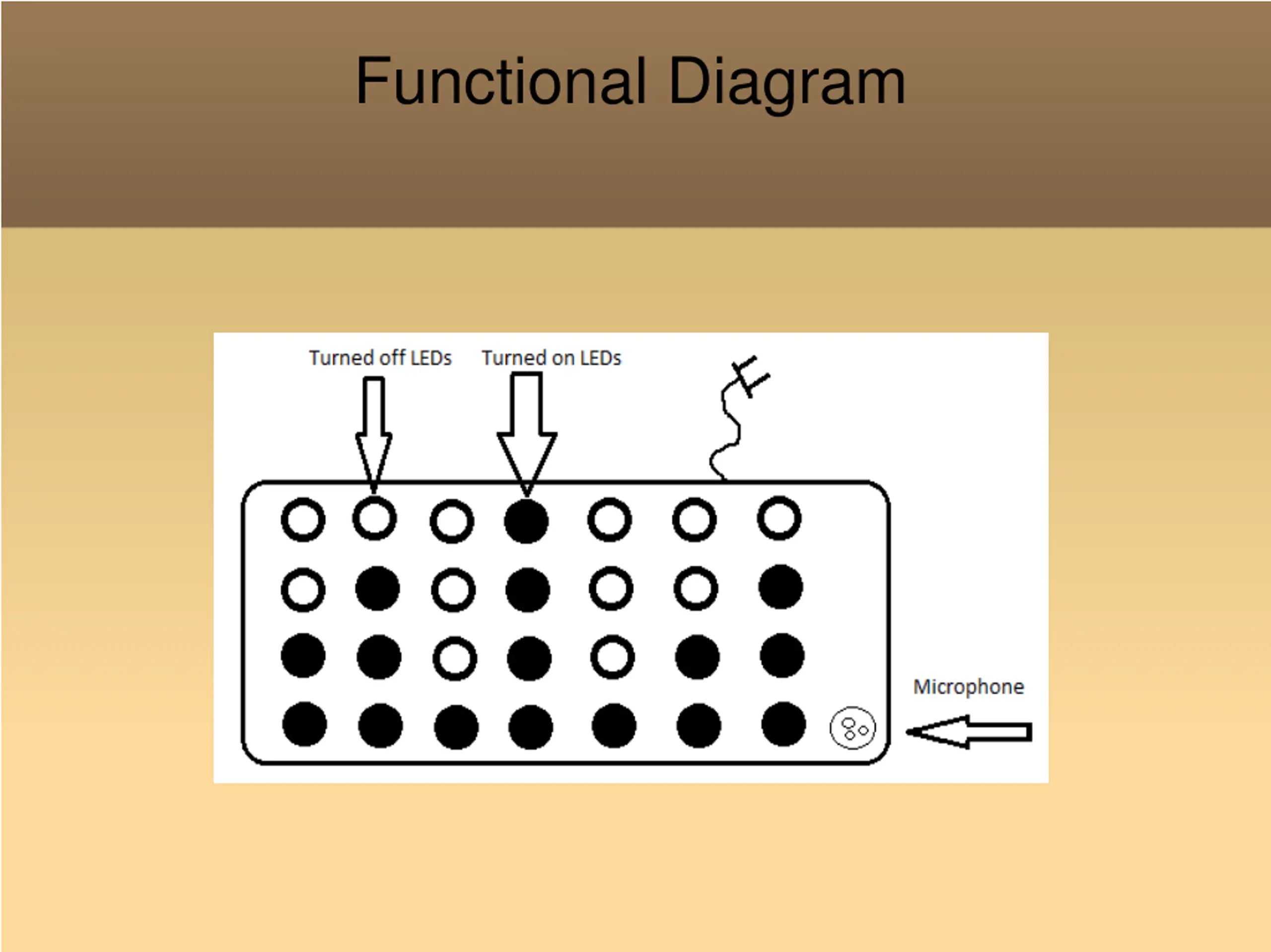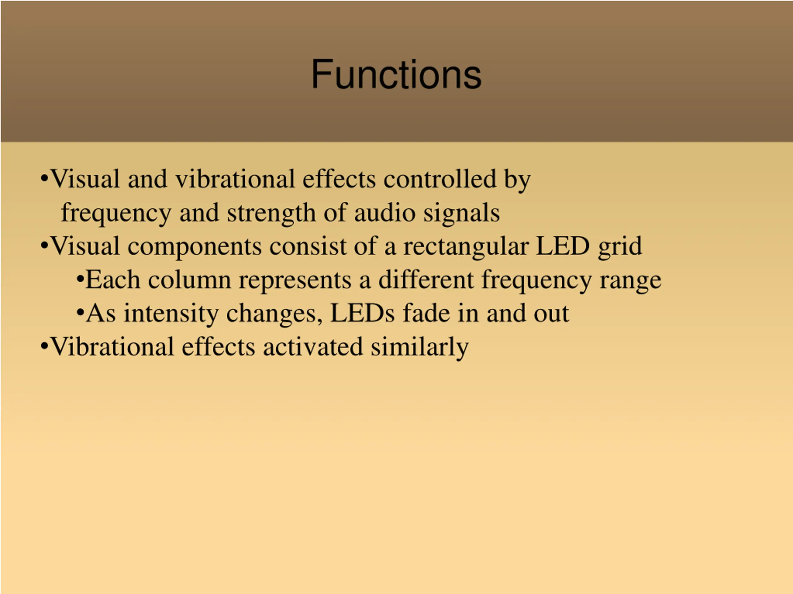 Functions Visual and vibrational effects controlled by frequency and strength of audio signals Visual components consist of a rectangular LED grid Each column represents a different frequency range As intensity changes, LEDs fade in and out Vibrational effects activated similarly