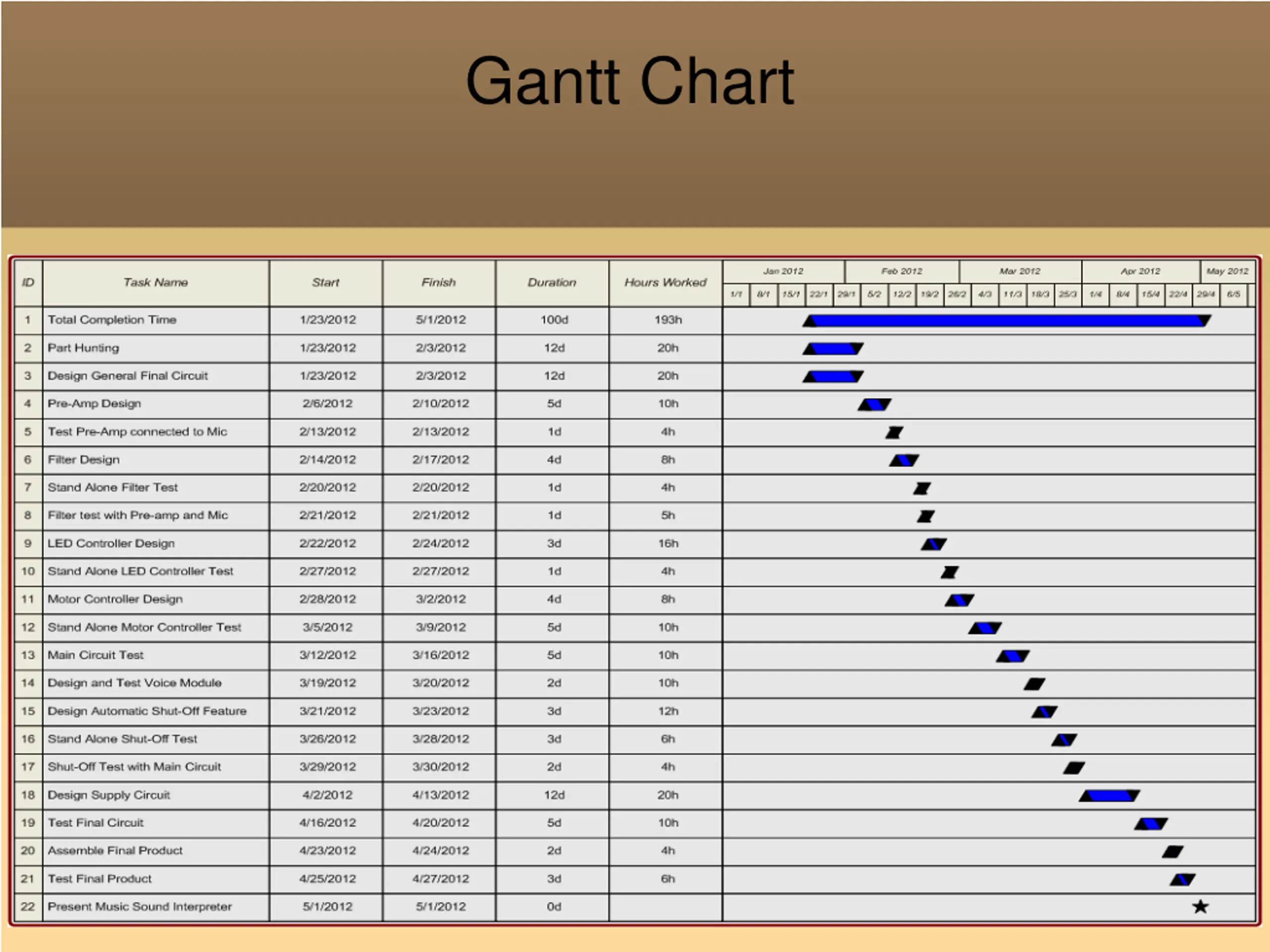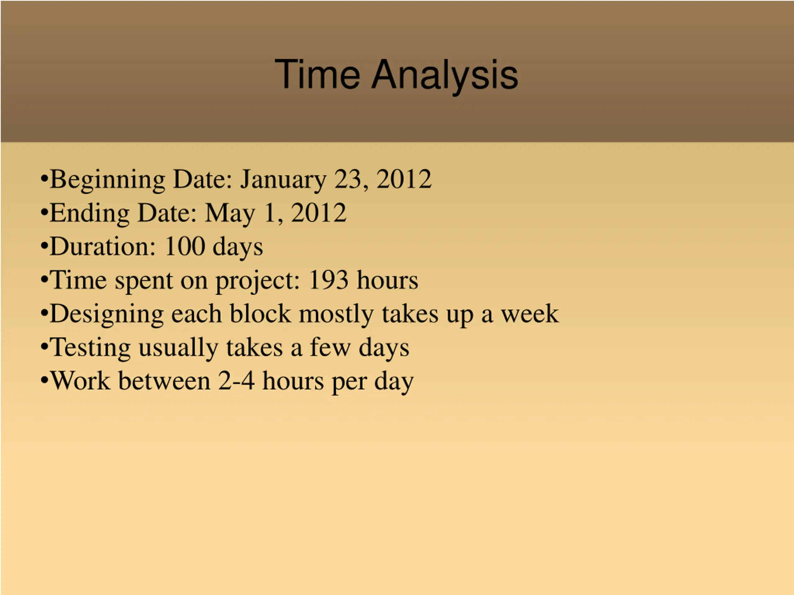Time Analysis Beginning Date: January 23, 2012 Ending Date: May 1, 2012 Duration: 100 days Time spent on project: 193 hours Designing each block mostly takes up a week Testing usually takes a few days Work between 2-4 hours per day