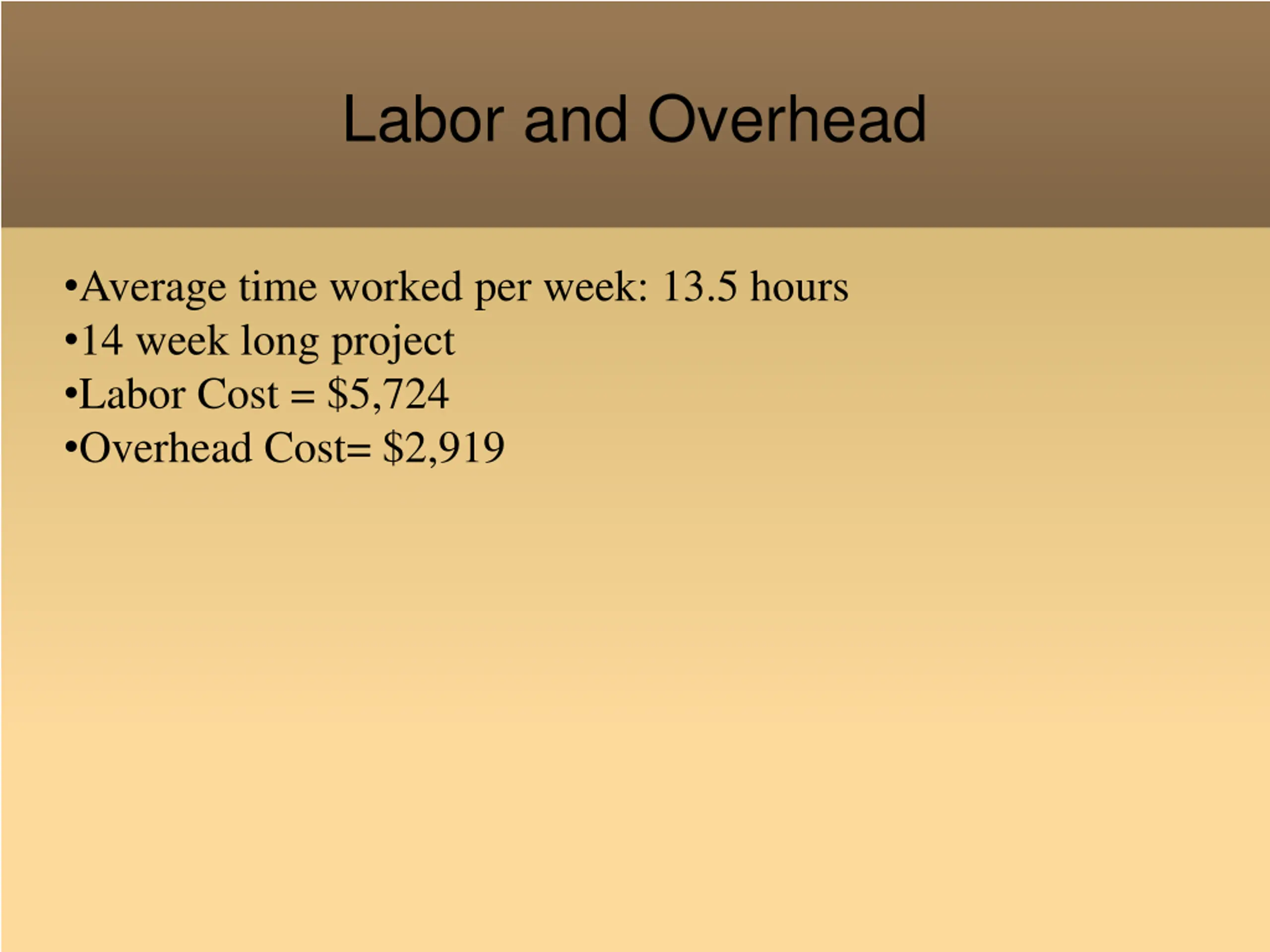 Labor and Overhead Average time worked per week: 13.5 hours 14 week long project Labor Cost = $5,724 Overhead Cost= $2,919