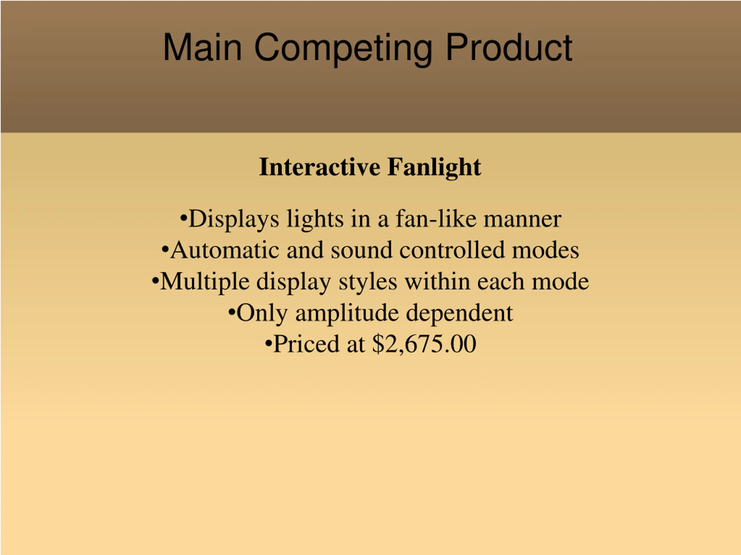 Main Competing Product Interactive Fanlight Displays lights in a fan-like manner Automatic and sound controlled modes Multiple display styles within each mode Only amplitude dependent Priced at $2,675.00