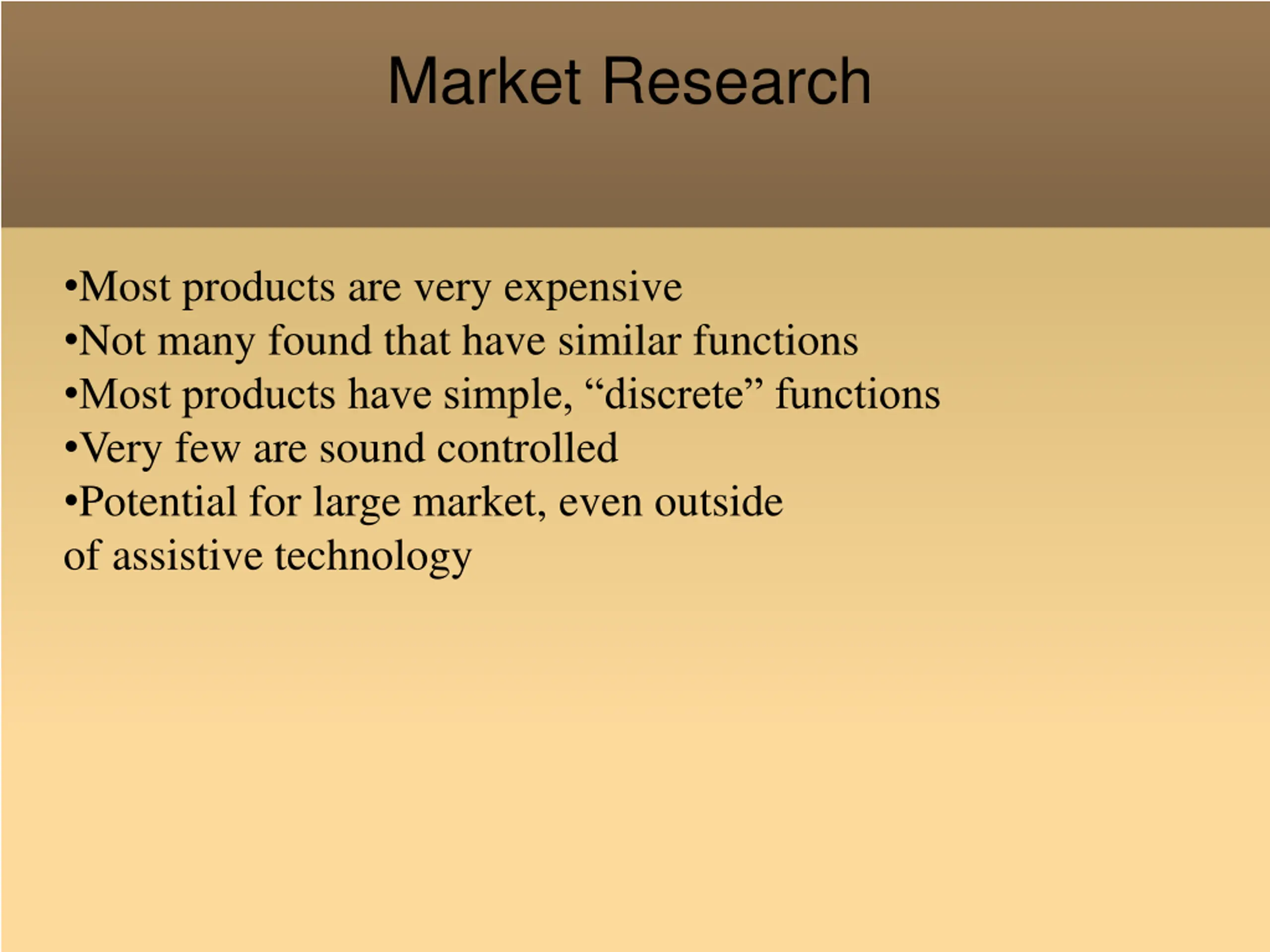 Market Research Most products are very expensive Not many found that have similar functions Most products have simple, discrete functions Very few are sound controlled Potential for large market, even outside of assistive technology