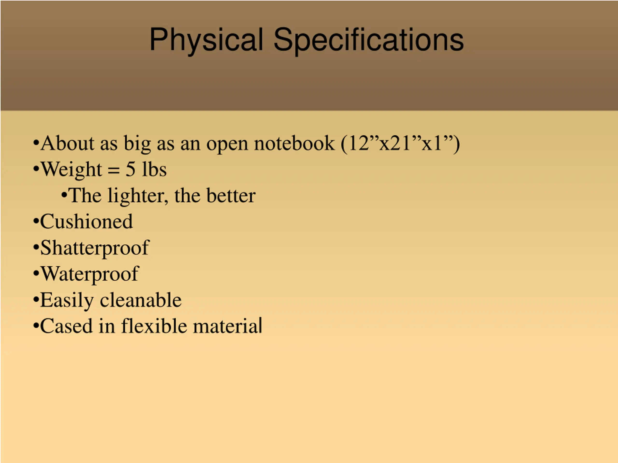 Physical Specifications About as big as an open notebook (12 x21 x1 ) Weight = 5 lbs The lighter, the better Cushioned Shatterproof Waterproof Easily cleanable Cased in flexible material