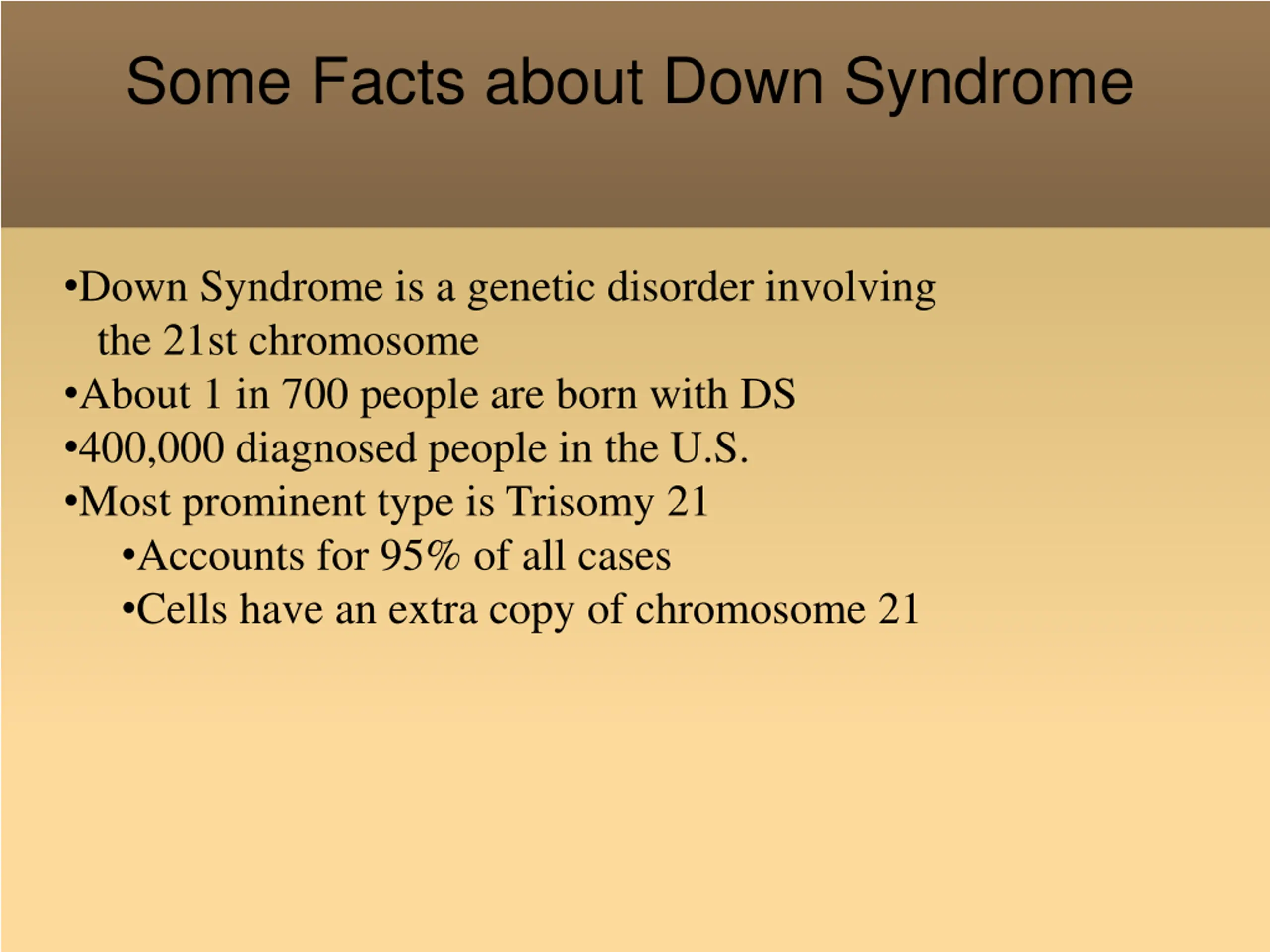Some Facts about Down Syndrome Down Syndrome is a genetic disorder involving the 21st chromosome About 1 in 700 people are born with DS 400,000 diagnosed people in the U.S. Most prominent type is Trisomy 21 Accounts for 95% of all cases Cells have an extra copy of chromosome 21