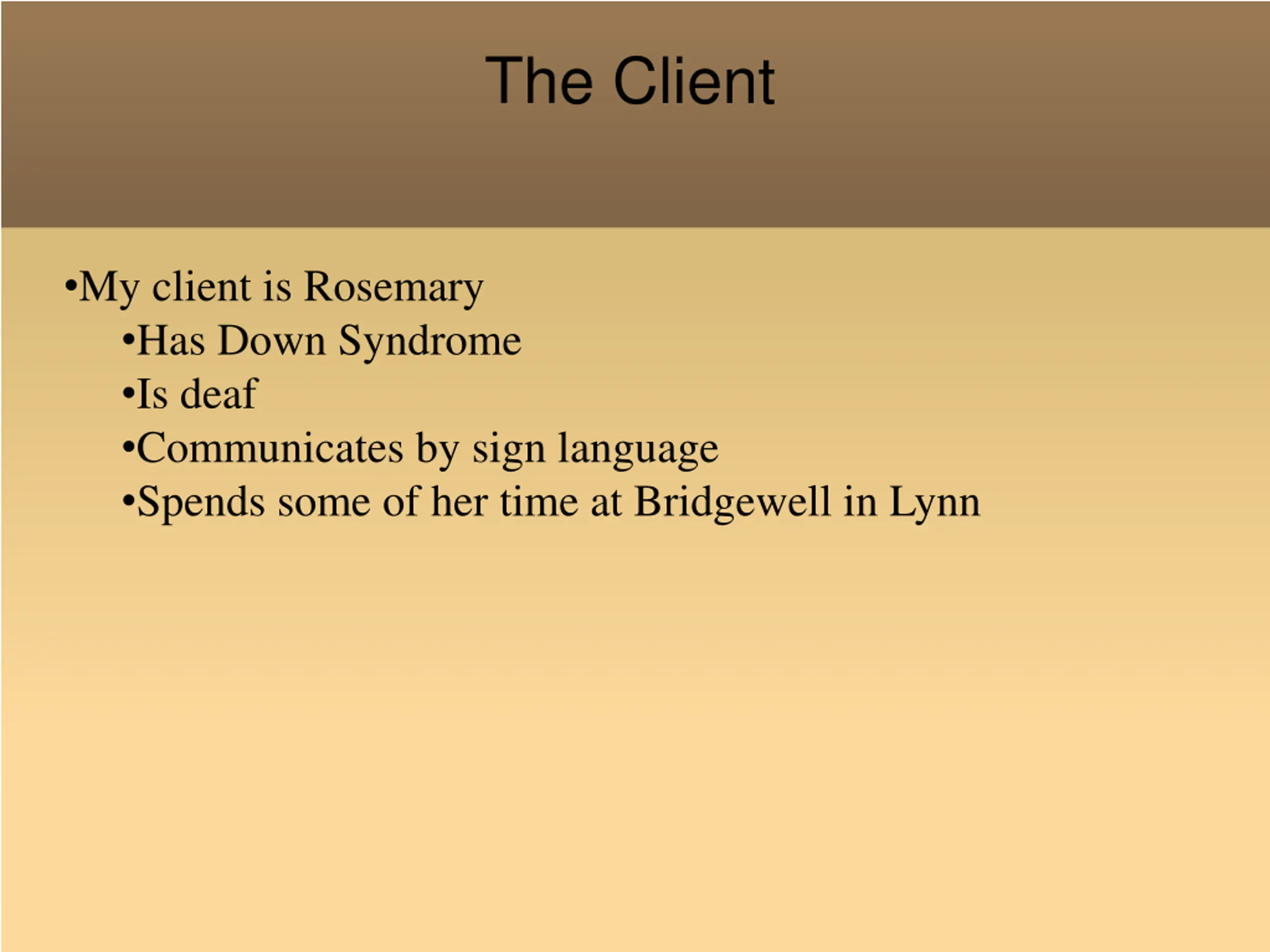 The Client My client is Rosemary Has Down Syndrome Is deaf Communicates by sign language Spends some of her time at Bridgewell in Lynn