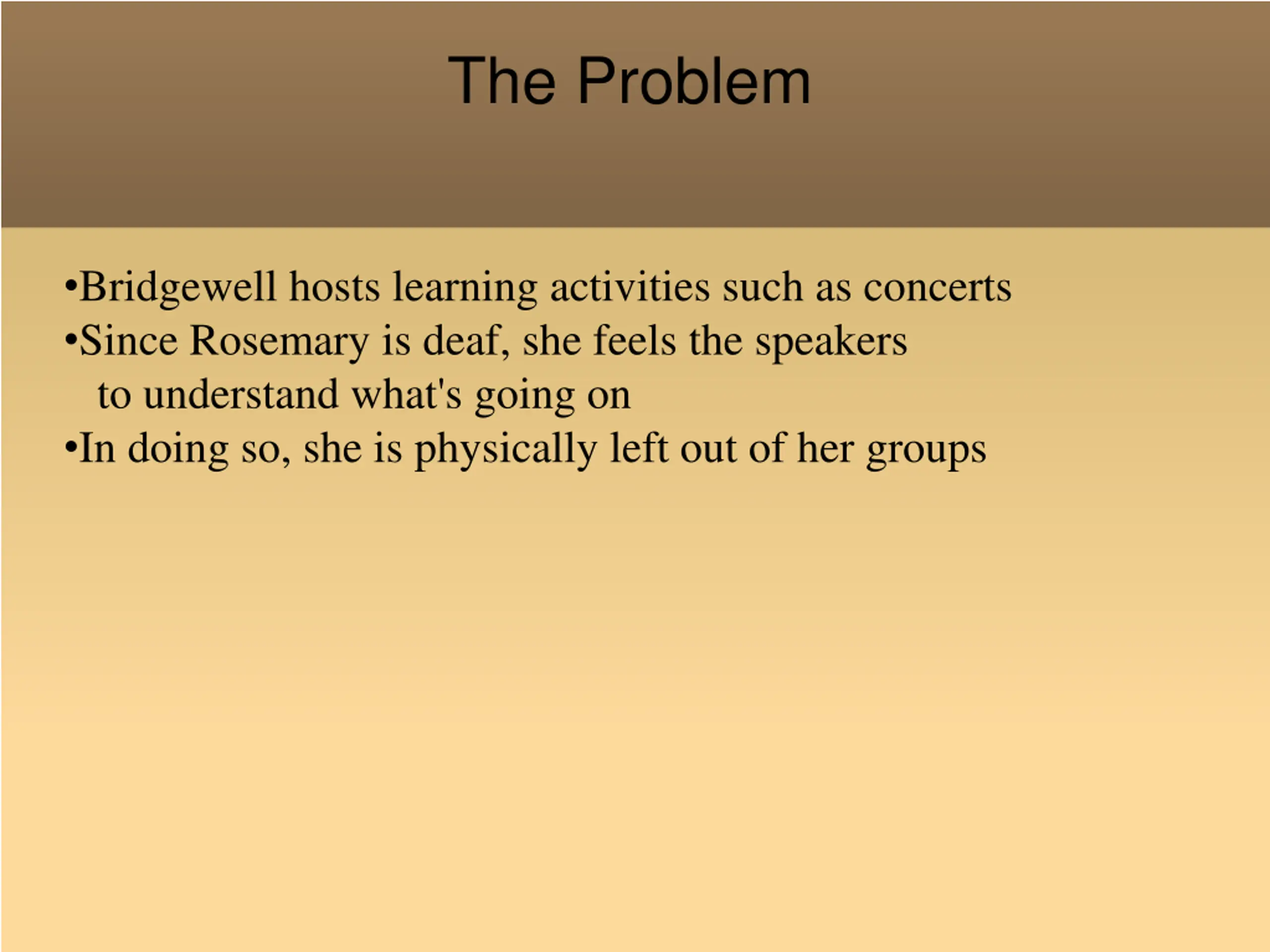 The Problem Bridgewell hosts learning activities such as concerts Since Rosemary is deaf, she feels the speakers to understand what's going on In doing so, she is physically left out of her groups