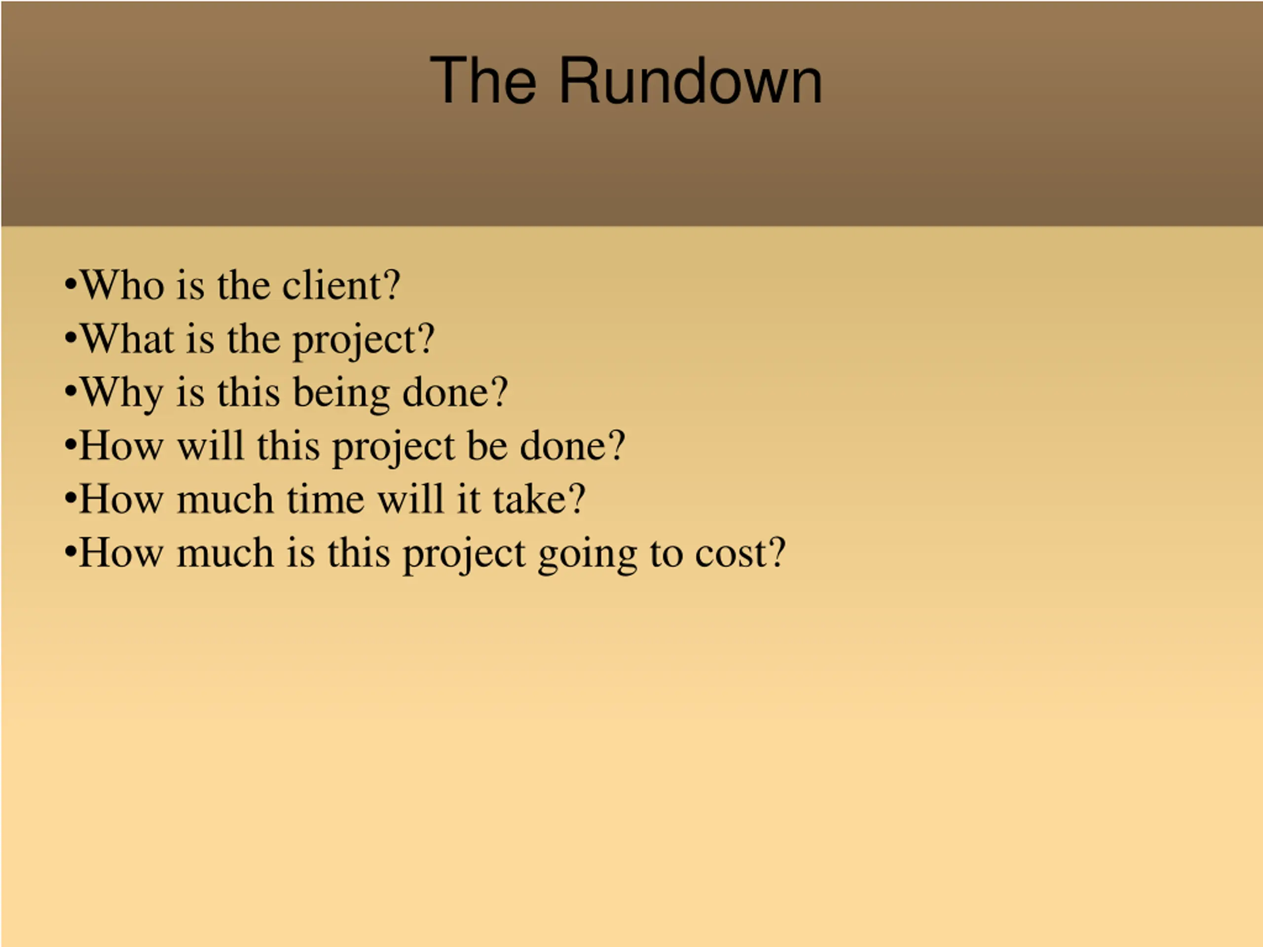 The Rundown Who is the client? What is the project? Why is this being done? How will this project be done? How much time will it take? How much is this project going to cost?