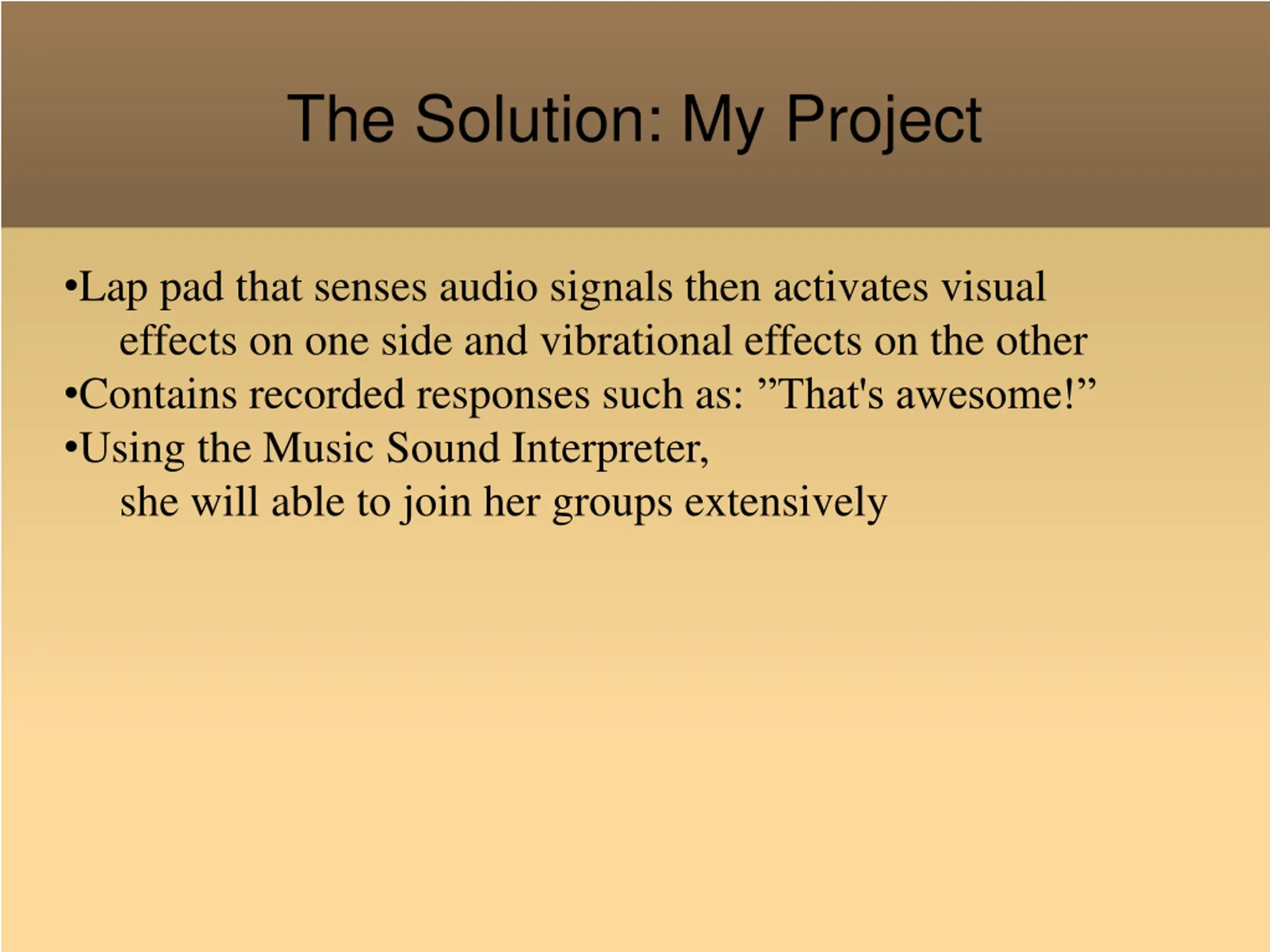 The Solution: My Project Lap pad that senses audio signals then activates visual effects on one side and vibrational effects on the other Contains recorded responses such as: That's awesome! Using the Music Sound Interpreter, she will able to join her groups extensively