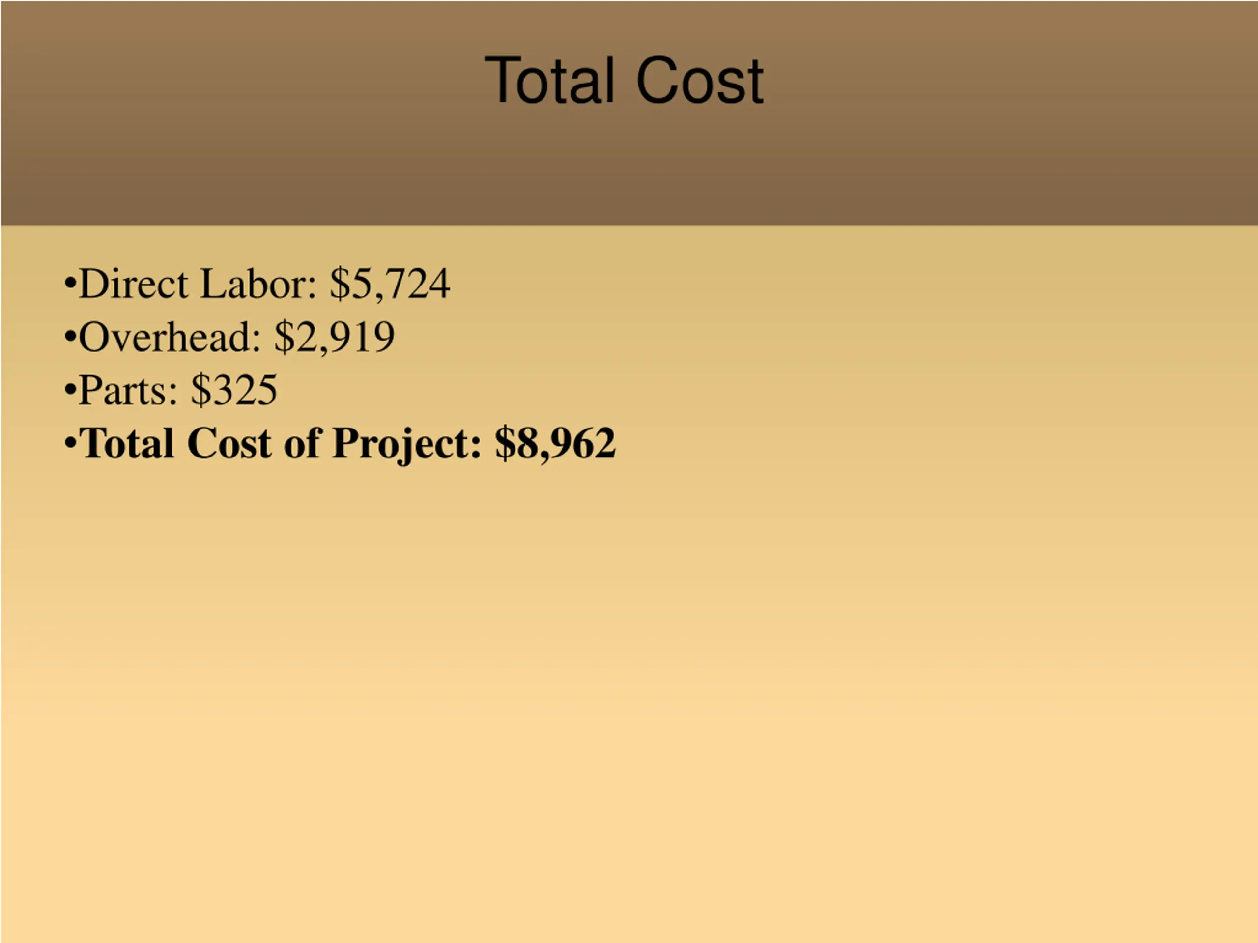 Total Cost Direct Labor: $5,724 Overhead: $2,919 Parts: $325 Total Cost of Project: $8,962