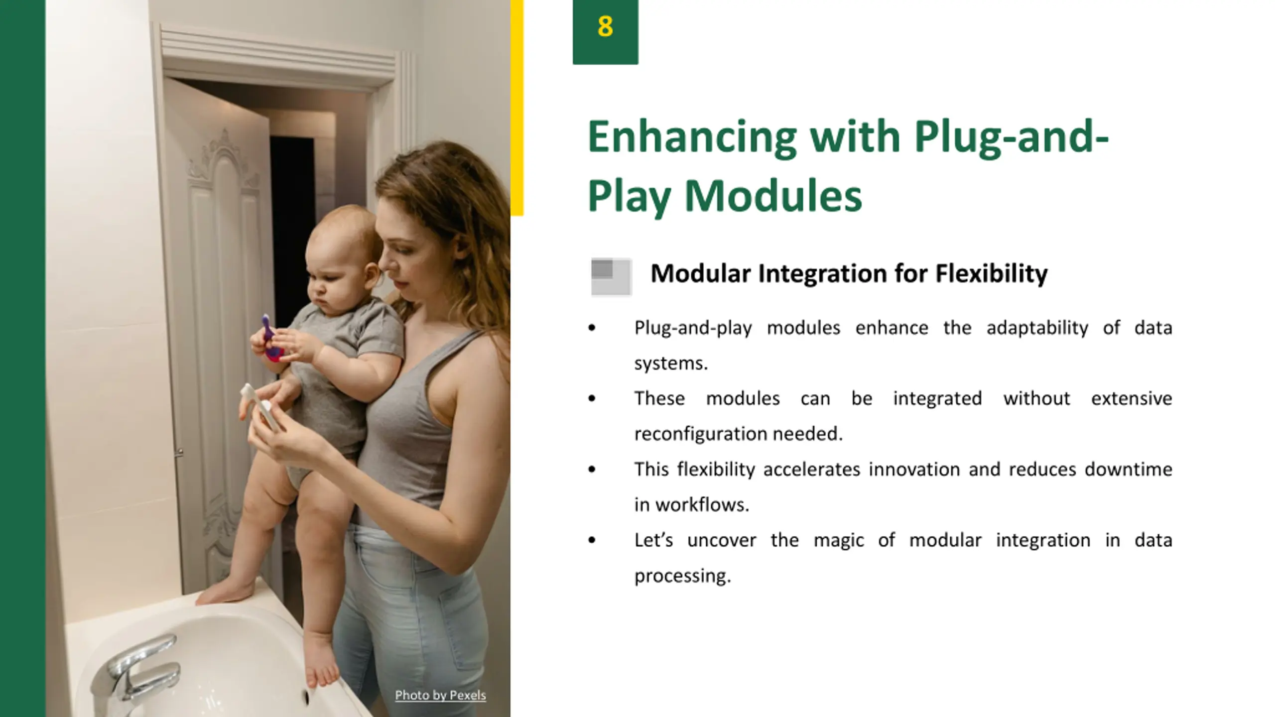 8 Enhancing with Plug-and- Play Modules Modular Integration for Flexibility Plug-and-play modules enhance the adaptability of data systems. These modules can be integrated without extensive reconfiguration needed. This flexibility accelerates innovation and reduces downtime in workflows. Let s uncover the magic of modular integration in data processing. Photo by Pexels