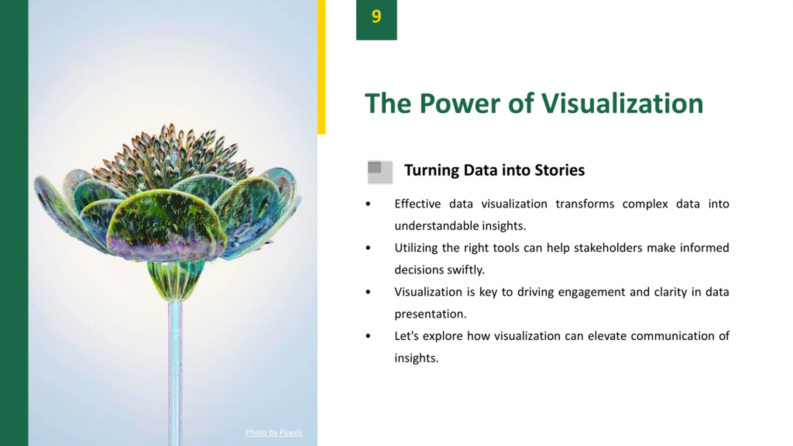 9 The Power of Visualization Turning Data into Stories Effective data visualization transforms complex data into understandable insights. Utilizing the right tools can help stakeholders make informed decisions swiftly. Visualization is key to driving engagement and clarity in data presentation. Let's explore how visualization can elevate communication of insights. Photo by Pexels