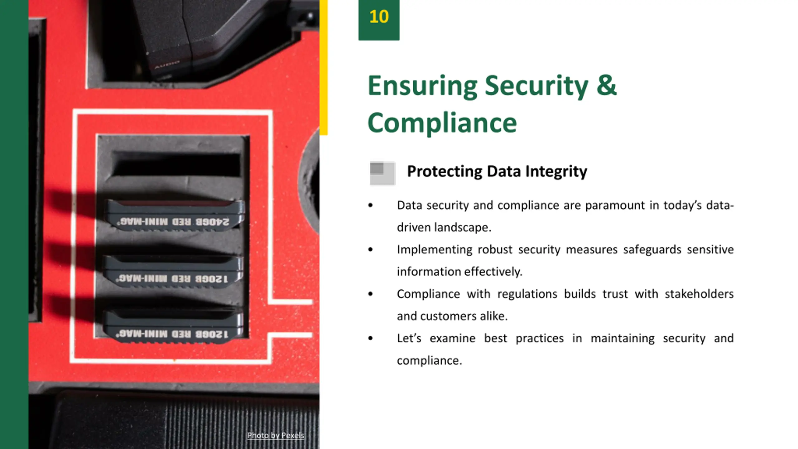 10 Ensuring Security & Compliance Protecting Data Integrity Data security and compliance are paramount in today s data- driven landscape. Implementing robust security measures safeguards sensitive information effectively. Compliance with regulations builds trust with stakeholders and customers alike. Let s examine best practices in maintaining security and compliance. Photo by Pexels