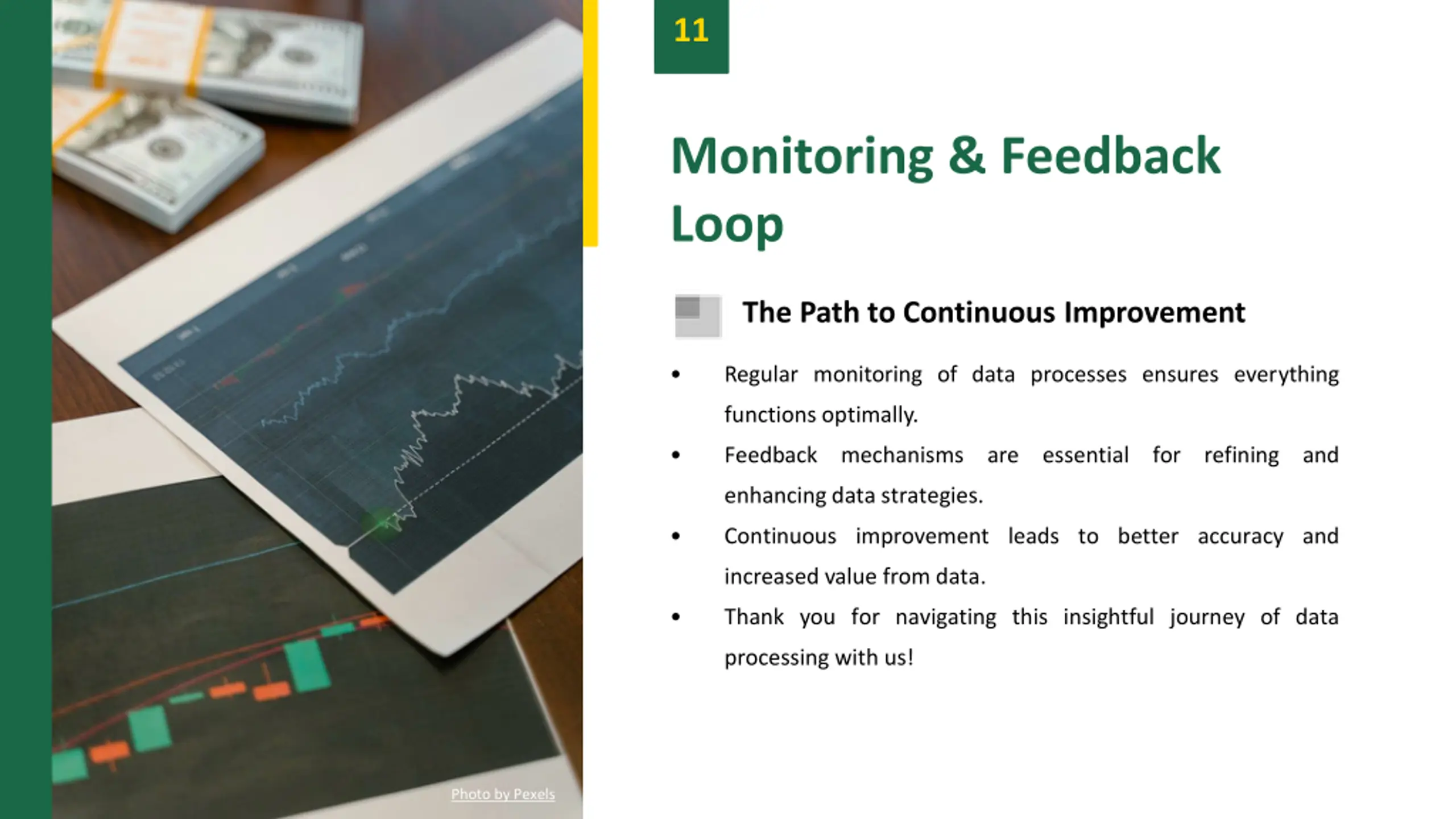 11 Monitoring & Feedback Loop The Path to Continuous Improvement Regular monitoring of data processes ensures everything functions optimally. Feedback mechanisms are essential for refining and enhancing data strategies. Continuous improvement leads to better accuracy and increased value from data. Thank you for navigating this insightful journey of data processing with us! Photo by Pexels