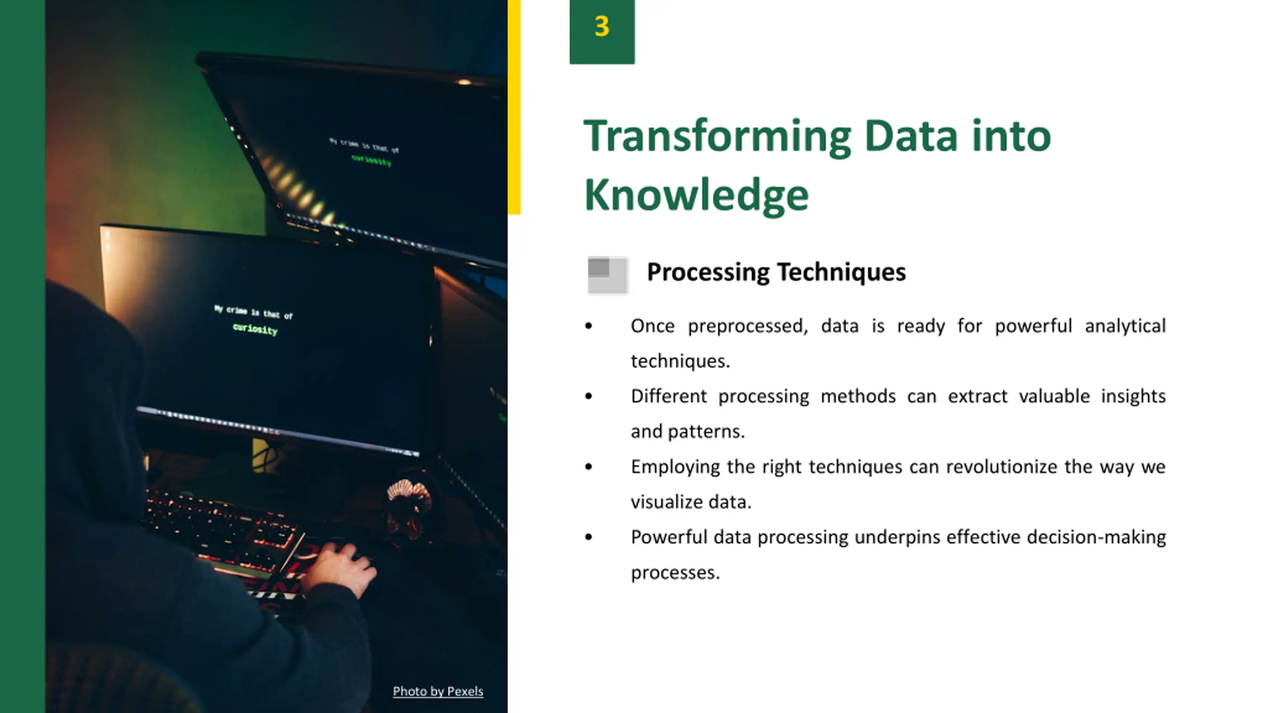 3 Transforming Data into Knowledge Processing Techniques Once preprocessed, data is ready for powerful analytical techniques. Different processing methods can extract valuable insights and patterns. Employing the right techniques can revolutionize the way we visualize data. Powerful data processing underpins effective decision-making processes. Photo by Pexels
