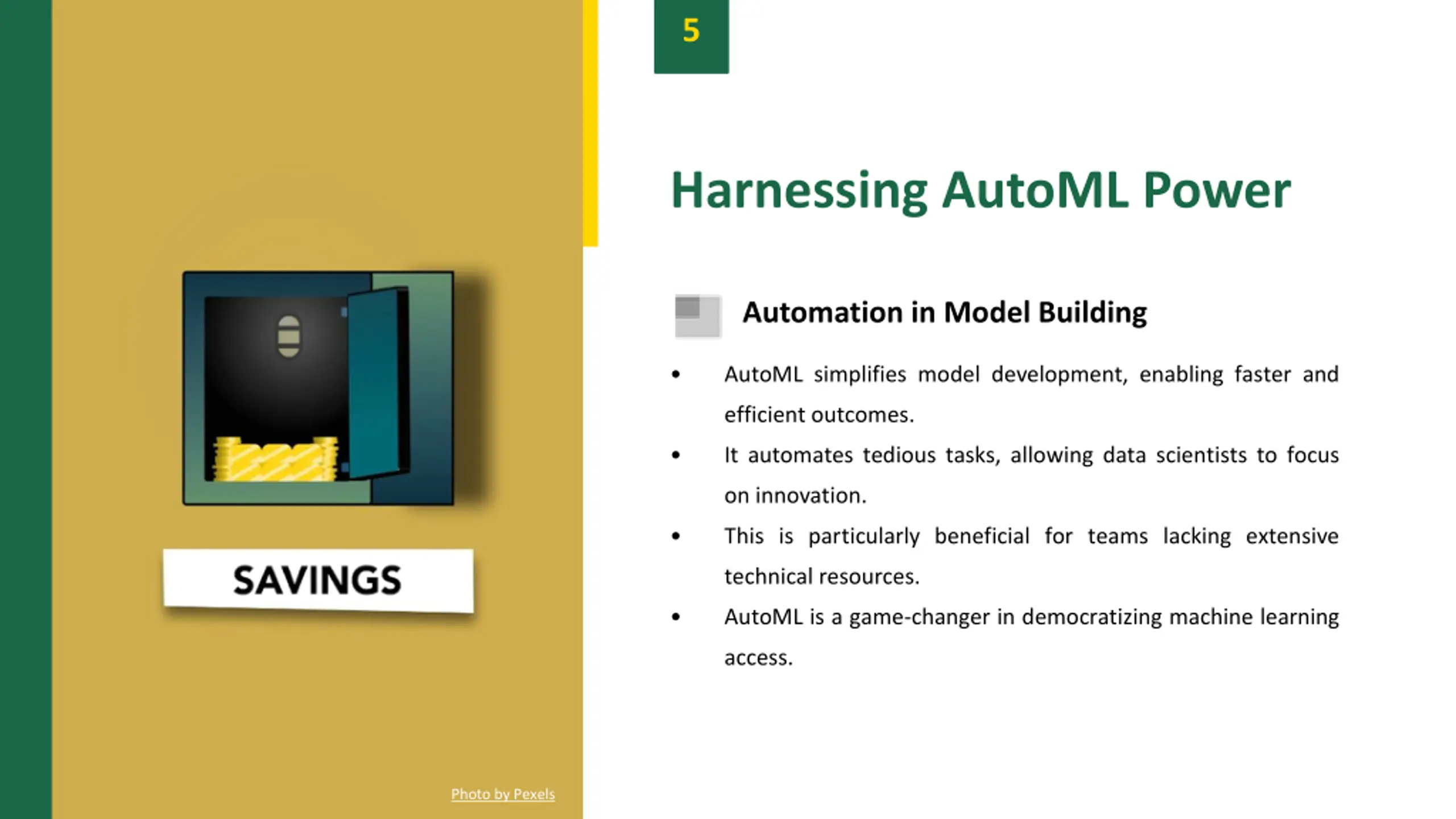 5 Harnessing AutoML Power Automation in Model Building AutoML simplifies model development, enabling faster and efficient outcomes. It automates tedious tasks, allowing data scientists to focus on innovation. This is particularly beneficial for teams lacking extensive technical resources. AutoML is a game-changer in democratizing machine learning access. Photo by Pexels