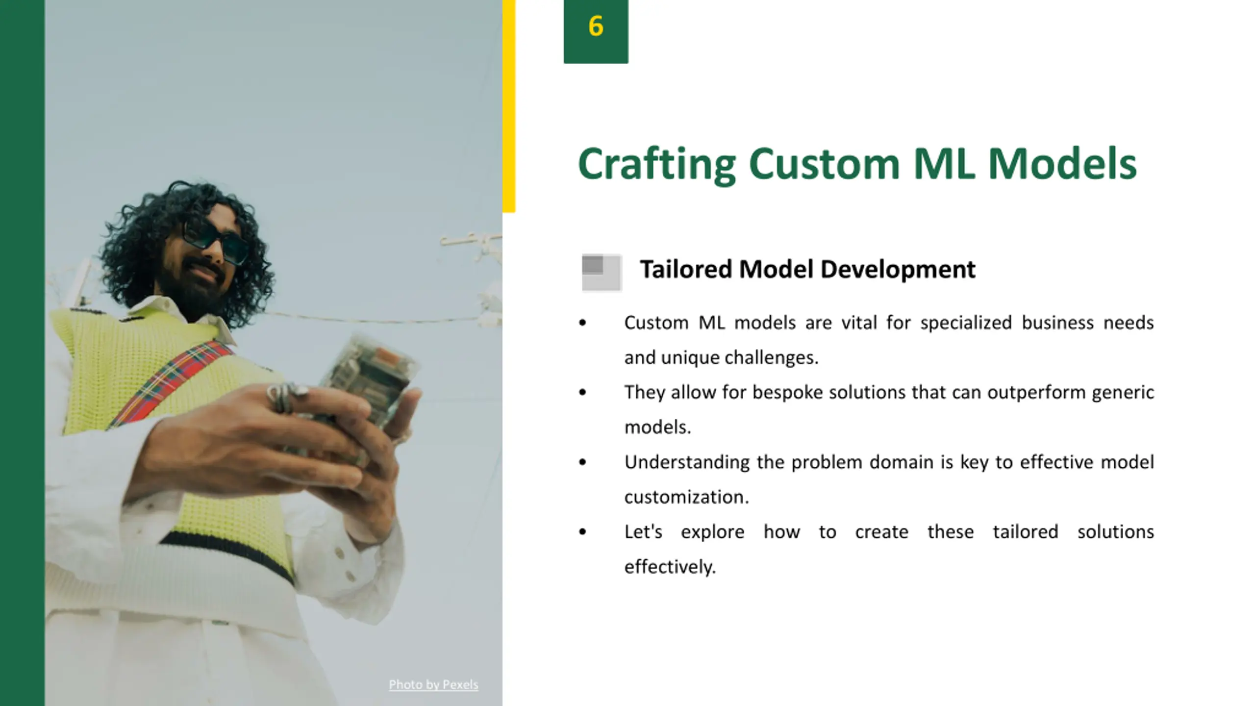 6 Crafting Custom ML Models Tailored Model Development Custom ML models are vital for specialized business needs and unique challenges. They allow for bespoke solutions that can outperform generic models. Understanding the problem domain is key to effective model customization. Let's explore how to create these tailored solutions effectively. Photo by Pexels